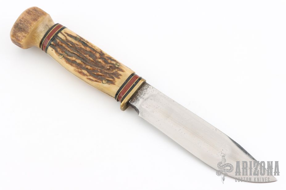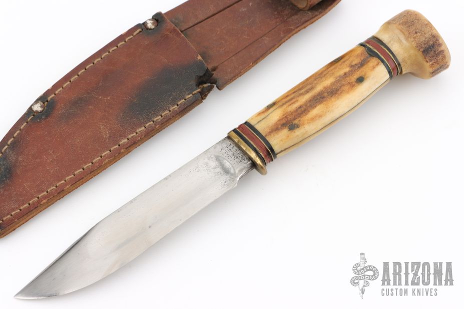 This Ideal Hunter by Marbles was made in Gladstone Michigan. It features a satin finished blade with fullers, .179" blade stock, .935" blade depth, hidden tang construction. The handle has a brass guard, stag grip, stag pommel, black/brass/red spacers. Has some scuffs, scratches, and patina. Comes with a leather belt sheath. Good condition for its age and otherwise.