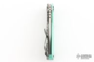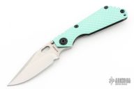 This SNG DGG by Strider has a satin/stonewashe finished bowie blade with dual thumb studs, thumb hole, and notched thumb rest. Handle is TactiBlue G-10 and bead blast and anodized titanium "Gunner Grip", lockbar stabilizer, and titanium tip up clip. Nice detent, lockup and blade seating. New condition.