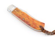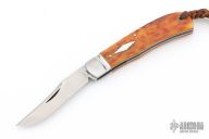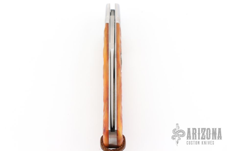 This Back Pocket by David Taber features a hand rub satin finished blade with a false top edge and nail nick. The handle has fluted stainless bolsters, stainless steel escutcheon, jigged bone covers, stainless liners and spring. Half stop on blade, flush in all positions. Nice walk and talk. Excellent fit and finish. Comes with a leather sheath and COA dated June 2025. New from maker!