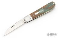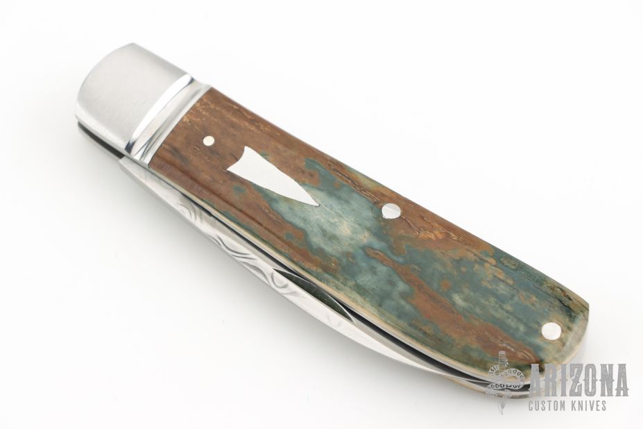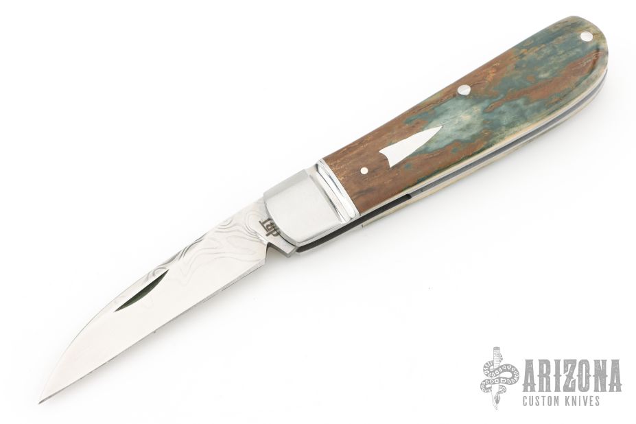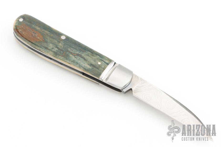 This Swayback from Dr. T. has a hand rub satin finished Damacore blade with nail nick. The handle has fluted stainless steel bolsters, blue mammoth ivory covers with stainless steel escutcheon, stainless steel liners and spring. Spring is flush in the closed, half stop, and opened position. Comes with a leather slip sheath and COA dated June 2025. New from maker.