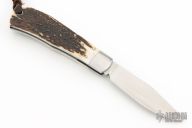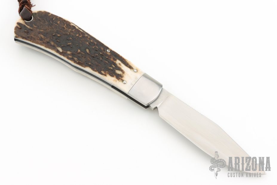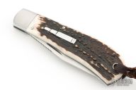 This Remington 1306 Lockback by David Taber features a hand rub satin finished blade with nail nick and notched thumbrest. The handle has satin finished stainless steel bolsters, stag covers, stainless steel liners, escutcheon and spring. Comes with a zippered case and COA dated July 2025. New from maker!