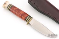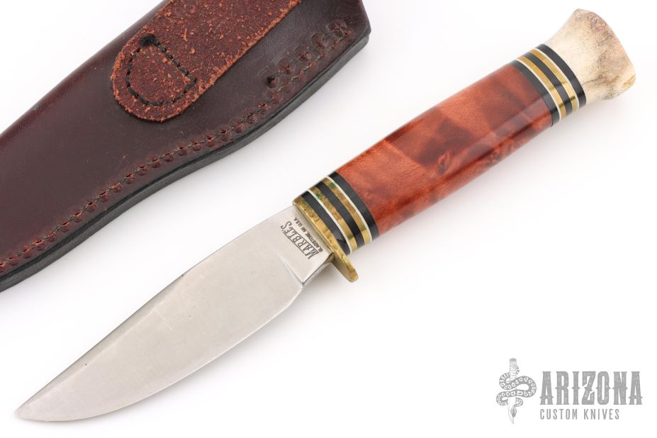 This Handy by Marbles features a satin finished blade, .164" blade stock and 1.026" blade depth, hidden tang construction. The handle has a brass guard with a wood grip and black/brass/white/red spacers and stag butt cap. Comes with a brown leather sheath. Has some scuffs and patina good condition otherwise.