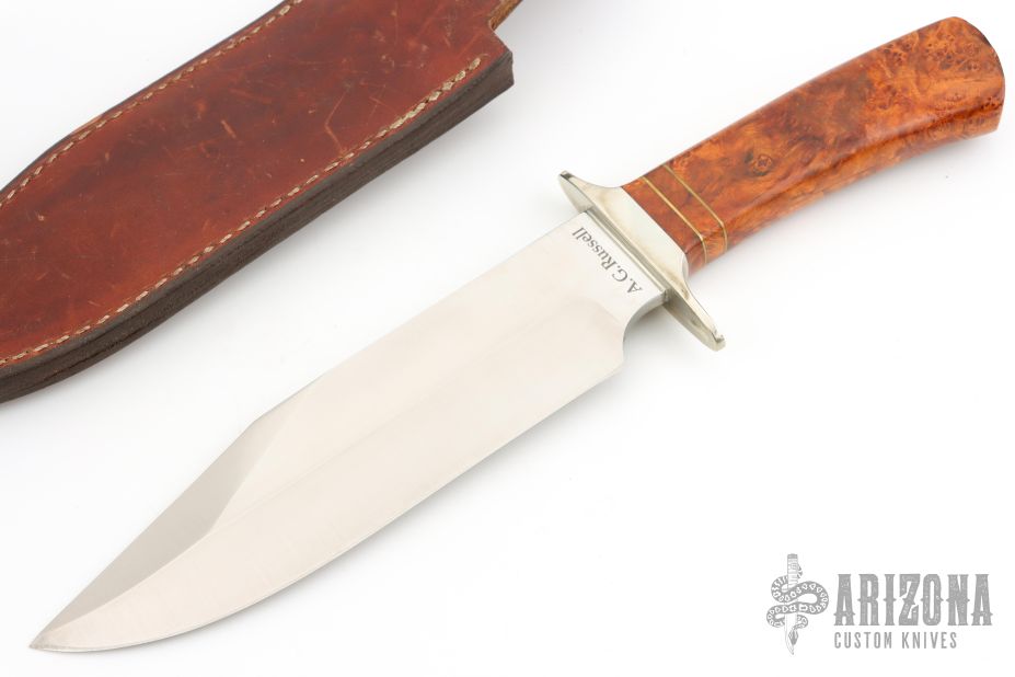 "I was born in Eudora, Arkansas, in the extreme southeast corner. I have been designing knives almost since I could first hold a pencil. When I was nine, my grandfather helped me make my first knife. It was a knife that only a mother could love. But I only improved from there. I made knives for fun until the early 1960s when I started selling them as a business. I have founded the oldest mail order knife business (1964), the oldest knife collectors club (1969-1970), and the oldest after-market knife business (1968). I've had a wonderful fifty plus years in this business. Stage by stage we have outgrown our quarters, to the point that I feel like a chambered nautilus. I moved from my kitchen table to a small building on my farm (1966), and then moved again to a larger but still small building in Springdale (1971). I bought the property and doubled the office space (1974), then in 1995, built a fine new 8,000 sq. ft. building. Very quickly, that space was filled. In March of 2002, we moved into new facilities located on Interstate 49, just up the road from our long-time location in Springdale, Arkansas. In November of 1988, my wife Goldie joined the business. She began by using her art background to produce the best catalog we had ever mailed. We mailed ten times as many catalogs as we had ever mailed before. Every year since 1988, our catalogs have increased in quality, as well as the number mailed. It took Goldie about two years to learn everything that I had learned in a lifetime of designing and making knives, then learning how to market them. By mid-1990, Goldie had assumed more and more responsibility, to the point that she was actually running the company. She is now the president and chief executive officer of this company and runs it better than I ever have, which accounts for our growth. Goldie has now been in the knife business for decades, and is considered an authority on knives. In June 2014 she became the first woman accepted into the Cutlery Hall of Fame, which also made us the first couple to have this honor together. There are now almost 40 of us who work to produce all those catalogs to help you acquire that perfectly suited knife. I design knives, work with knifemakers and with the companies who make the great production knives which we sell. I write copy for the brochures and catalogs, while Goldie does the tough day-to-day grind of running an ever-growing business. Over the years I have had the opportunity to work with, and know as my friends, the great knifemakers of the 20th Century; men such as R. W. (Bob) Loveless, R. L. (Bob Dozier), D'Alton Holder, Jess Horn, Ron Lake, Buster Warenski and D. E. (Ed) Henry. Hundreds of very fine knifemakers have blessed me with their friendship, as have thousands of knife collectors. I have been involved with guns and knives most of my life and my life has been much fuller because of that." Founder - A. G. Russell Knives, Inc. (1964), Co-Founder and Honorary President - Knifemakers Guild (1970), President - The Knife Collectors Club (1970), First Honoree - Knife Digest Cutlery Hall of Fame (1974), Blade Magazine Cutlery Hall of Fame (1988), Regent - The American Knife and Tool Institute. A.G. Russell passed away in 2018.