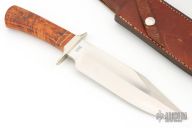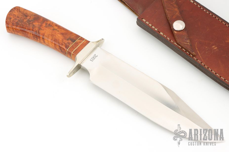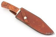 Made by Schrade in the USA.  440c 3/16" thick blade.  Maple handle with brass spacers and double guard in nickel silver guard.  1 7/8" blade depth. Comes with brown leather sheath. Has some light scratches and patina, otherwise excellent condition.