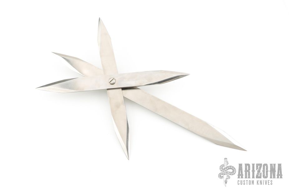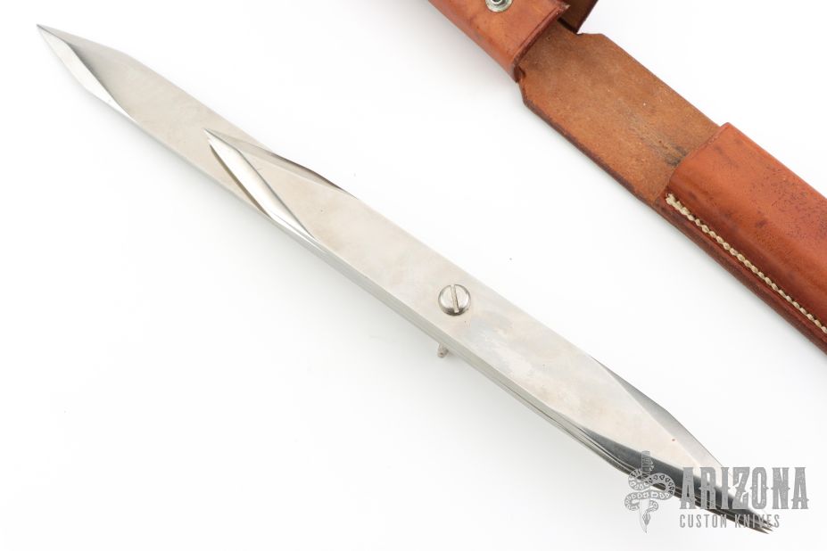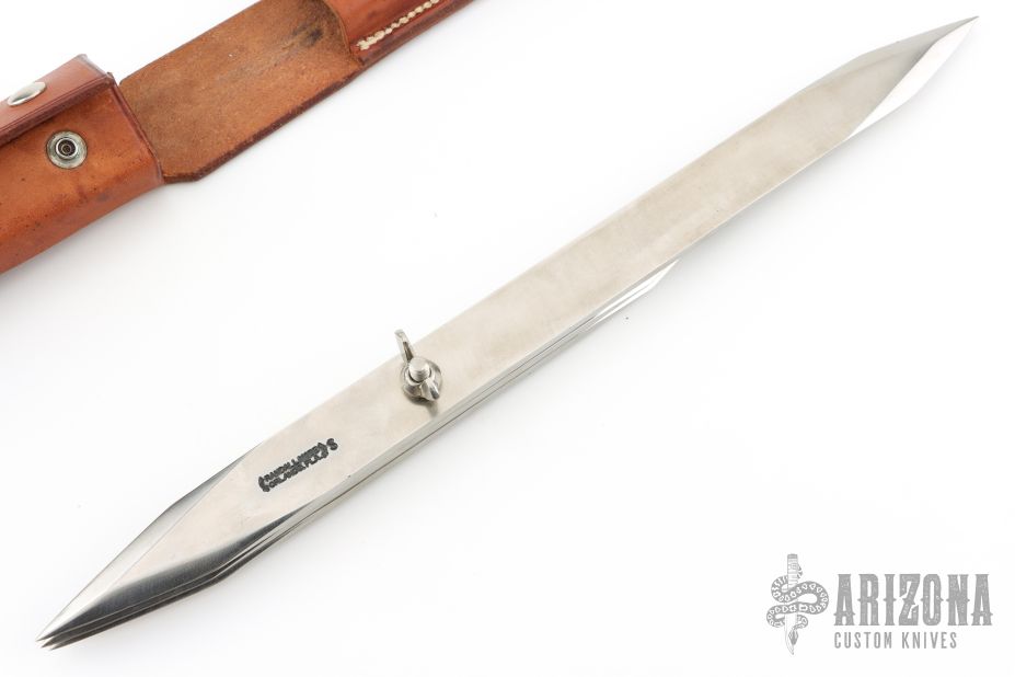 This Multi-Blade Throwing knife by Randall Made Knives is VERY RARE, and only about 30 were made. It features satin finished blades, the long blade is 15" overall, the short blades are 10.5" overall. Comes with original Johnson brown leather sheath. Excellent condition. Comes with a Randall zippered case.