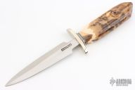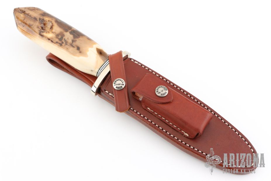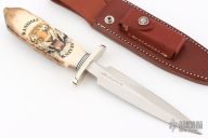 The Model 2 is a heavily made dagger or dirk. This knife has an 6" carbon steel blade with .207" blade stock and 1.152" blade depth, hidden tang construction. The blade is marked "Ivory Stiletto #2". The handle has a forward curved nickel silver guard, an Artifact fossil walrus ivory handle with black and duralumin spacers. The handle has been scrimshawed by Garbo. Comes with a brown leather sheath and a Randall zippered case. Excellent condition.