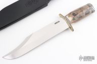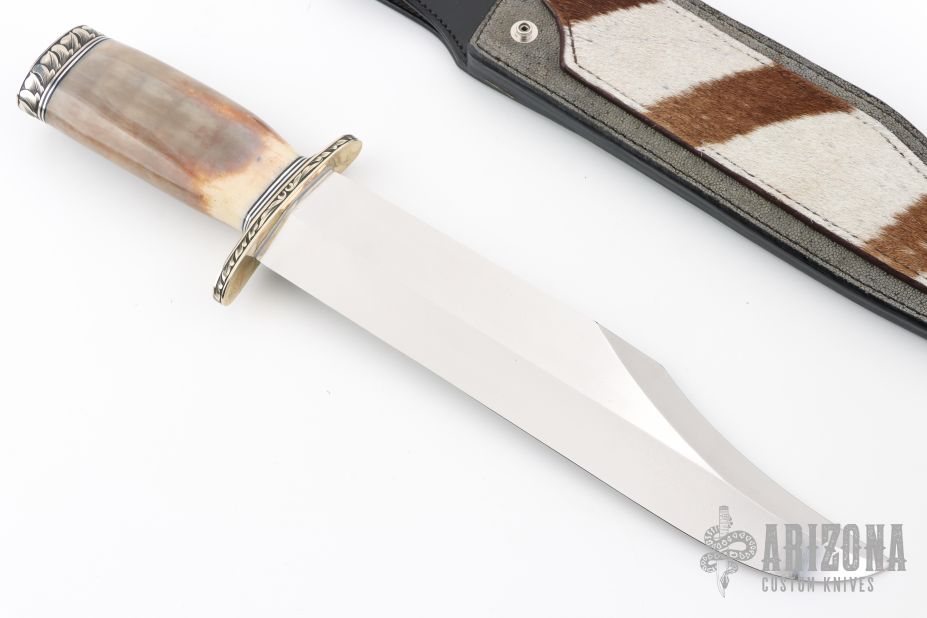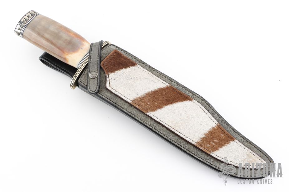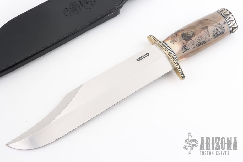 This Model 12-11 Smithsonian Bowie by Randall Made Knives features a satin finished carbon steel blade with sharpened top edge, .326" blade stock and 2.217" blade depth, hidden tang construction. The handle has a forward curved nickel silver guard and butt, fossil walrus ivory grip with black/duralumin spacers. The guard and butt have been engraved by RE Skaggs, and the grip has been scrimshawed by RE Skaggs. Comes with a Custom Sullivan's by Gutcher black leather sheath with elephant hide overlay with zebra hide overlay. Excellent condition. Comes with a zippered case.