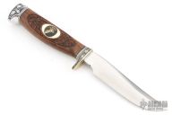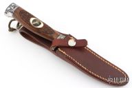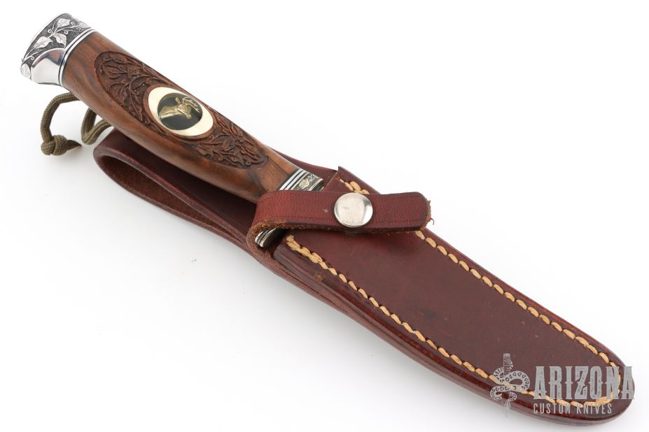 This Model 7-4 by Randall Made Knives features a satin finished upswept blade with notched thumbrest and false top edge, .166" blade stock and .920" blade depth, hidden tang construction. The handle has an engraved nickel silver guard with black /duralumin spacers, engraved duralumin butt and a carved walnut grip with walrus ivory inlays that have brass deer head insets. Comes with brown leather sheath and a Randall zippered case. Excellent condition. This knife has been engraved and carved by Leschorn. The butt has a silver deer head inset.