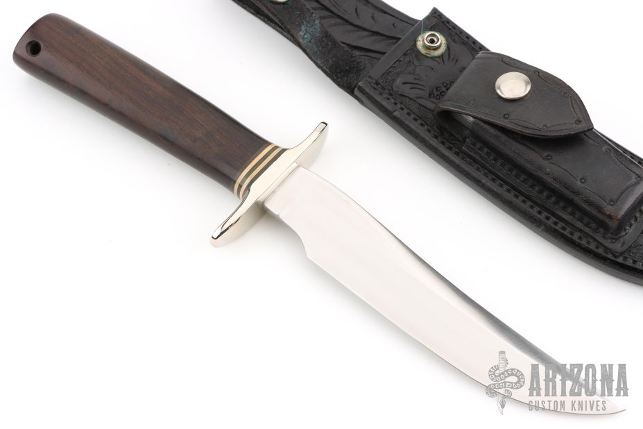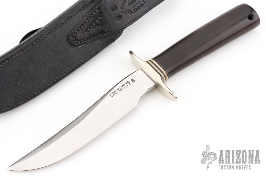 This Model 3-6 by Randall features a satin finished stainless steel blade with false top edge, .234" blade stock and 1.152" blade depth, hidden tang construction. The handle has a double nickel silver guard, ebony wood grip with blue/white spacers, compass in the butt and a lanyard hole. Comes with a hand tooled black leather sheath and a zippered case. Excellent condition.