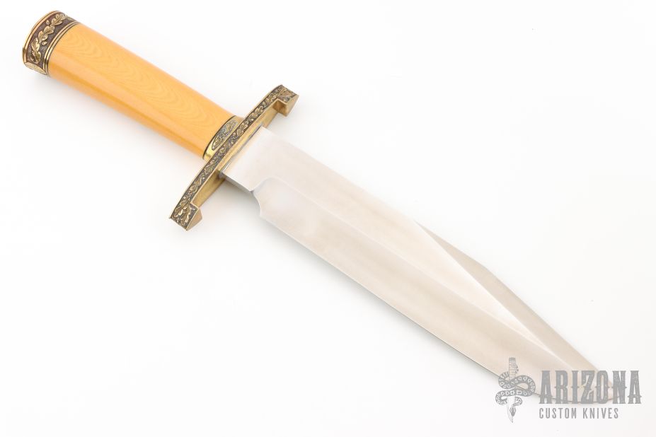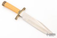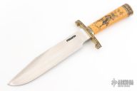 The Model 12-9 Sportsman Bowie by Randall Made Knives was made to meet the demand for a heavy-duty sporting knife of the Bowie type. This knife has a 9" blade with sharpened top edge, .245" blade stock and 1.798" blade depth, hidden tang construction. The handle has an engraved lugged brass guard and brass butt, yellow paper micarta grip with black/brass spacers. The handle has been scrimshawed by Rick Bowles dated '91 and #428, the scrimshaw is of an Indian Brave on Horseback". Engraving by TW Leschorn and dated 2/91. Comes with a zippered case. Excellent condition.