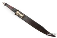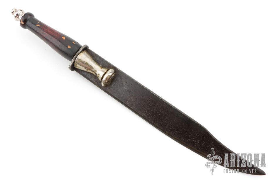 This knife features a black clip point blade with .125" blade stock and 1.118" blade depth, hidden tang construction. The handle has a steel guard, wood grip, and silver pommel/blade accent. Blade is marked "Texas" and has a "CS" or "CB" above the word Texas. There is rust/pitting/patina on the blade, as well as scratches, and dings. Fair condition.