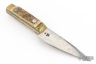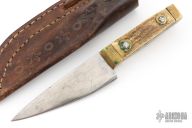 This knife features a polished clip point blade with .222" blade stock and 1.524" blade depth, full tang construction. The handle has a brass front/rear bolsters, and peened stag covers. Blade is marked with an Anvil and the letter "K". There is patina on the blade, as well as scratches and dings. Fair condition for its age.