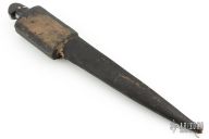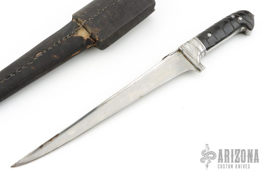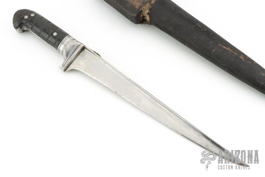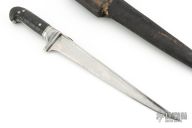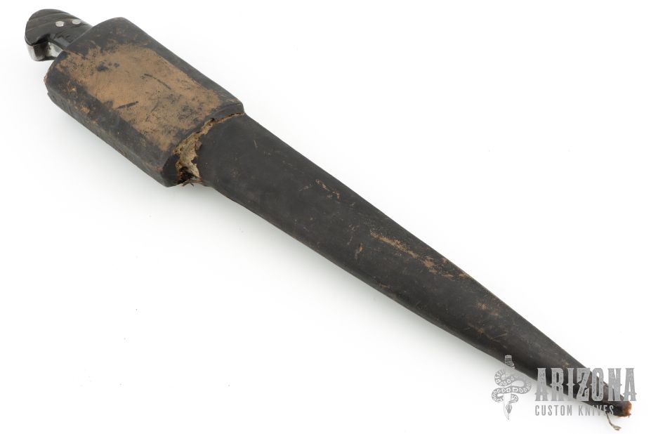 This Middle-Eastern Choora features a spear point blade with fullers, .414" blade stock and 1.495" blade depth, full tang construction. The handle has steel guard and horn scales. Comes in a hard sheath. Has patina, scratches, and the scales have shrunk, but otherwise fair condition for its age.