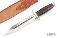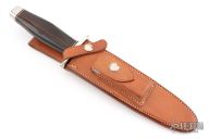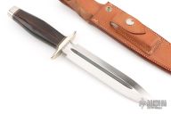 This Dagger by Tom Leschorn (who was the first of only 2 Randall shop engravers) features a hand rub satin finished double edged blade with fullers, .245" blade thickness and 1.290" blade depth, hidden tang construction. The handle has a nickel silver guard and aluminum butt, hand checkered ironwood grip with black/white spacers. Comes with a Johnson Roughback brown leather sheath marked 2-7 on the back and with a White Norton HB13 stone which indicate 1970 give or take. Comes with a COA from Duke McCaa and Mitchell Harrison verifying its authenticity as one of very few if any other knives by him that were not Randalls. The checkering on the handle is fantastic. Has a few light scratches, otherwise excellent condition. Comes with a zippered case.