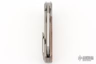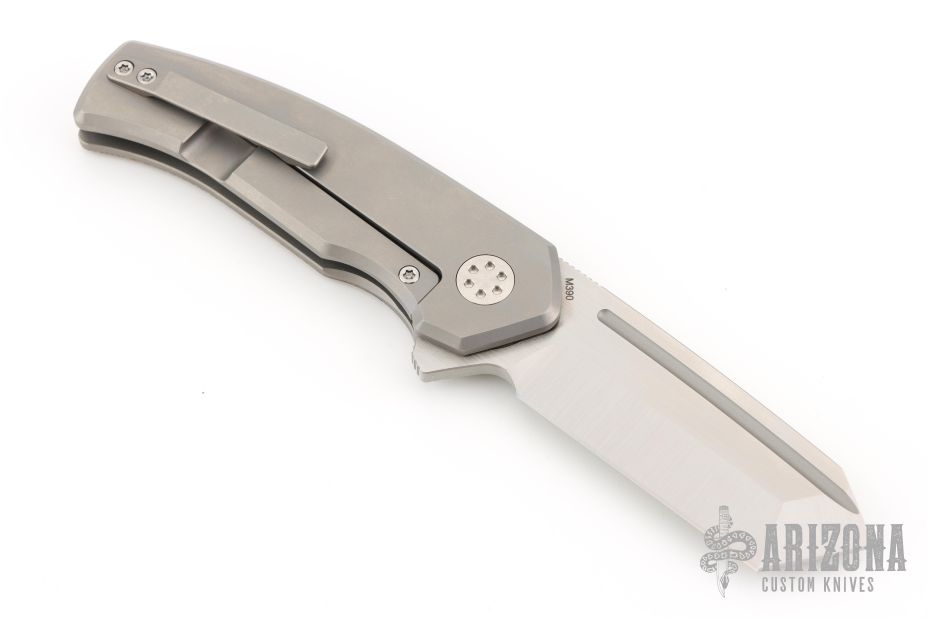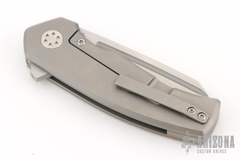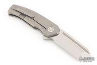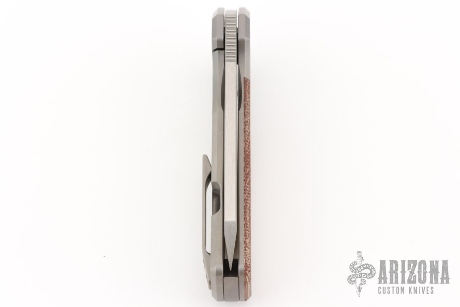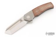 This Mini Warrior Folder by Beans Blades features a satin finished tanto blade with fullers, notched thumbrest and flipper. The handle has a bead blasted titanium frame with brown canvas micarta scale, bead blasted titanium backspacer and tip up clip. Rides on bearings, nice detent, lockup and blade seating. Comes with original box. Has a light scuff on the clip, otherwise excellent condition.