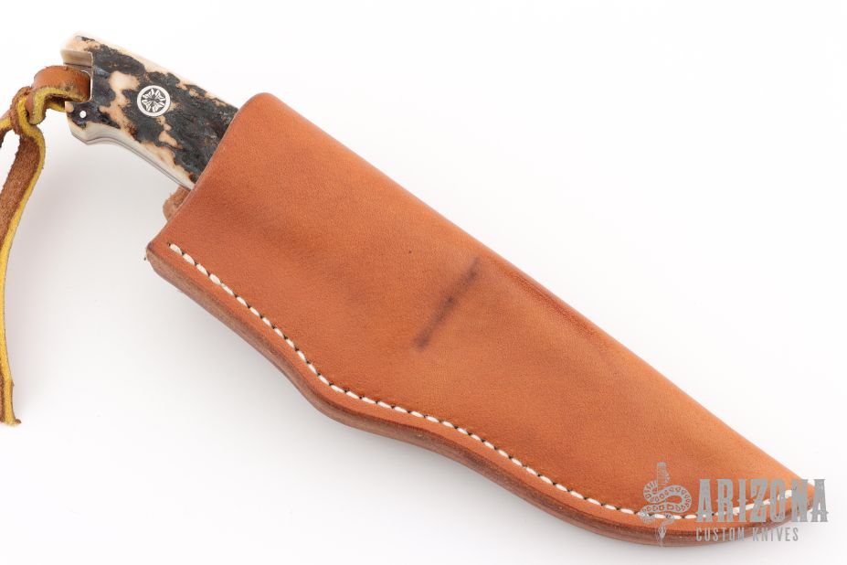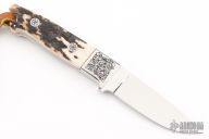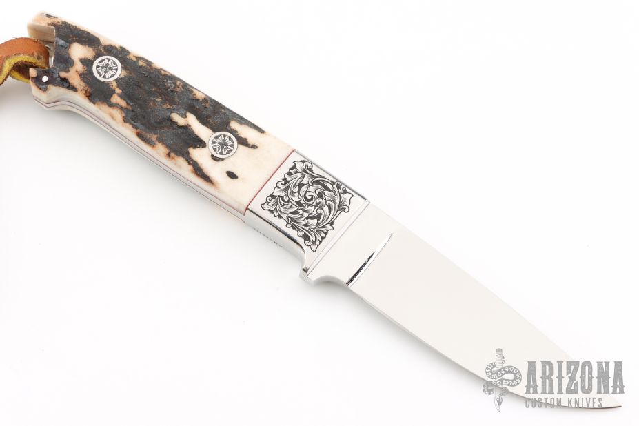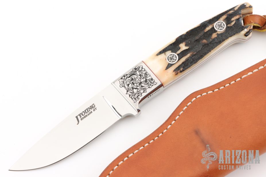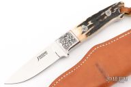 This Hunter by John Young features a mirror polished blade with .169" blade stock and .920" blade depth, full tapered tang construction. The handle has a mirror polished stainless bolsters, stag scales and red liners. Lanyard hole at butt. Comes with original signed brown leather sheath. The engraving was done on the bolsters and pins by Alice Carter. Excellent condition.