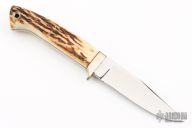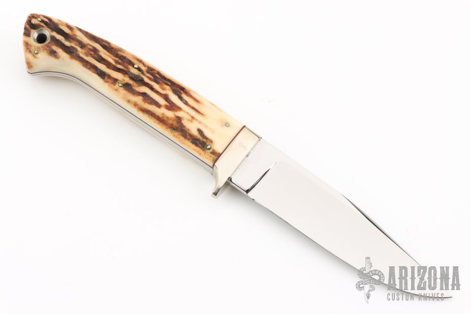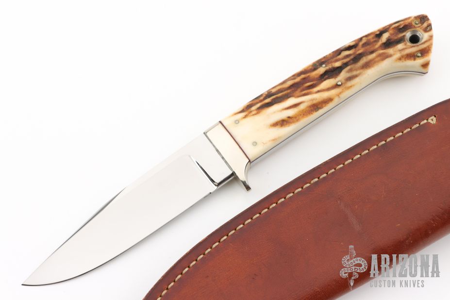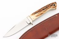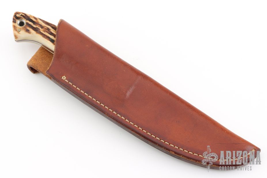 This Utility Hunter by Lloyd Pendleton features a mirror polished clip point blade with .191" blade stock and .956" blade depth, full tapered tang construction. The handle has a nickel silver guard and stag scales with red liners. Includes original brown leather sheath. Excellent condition.