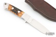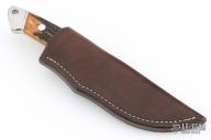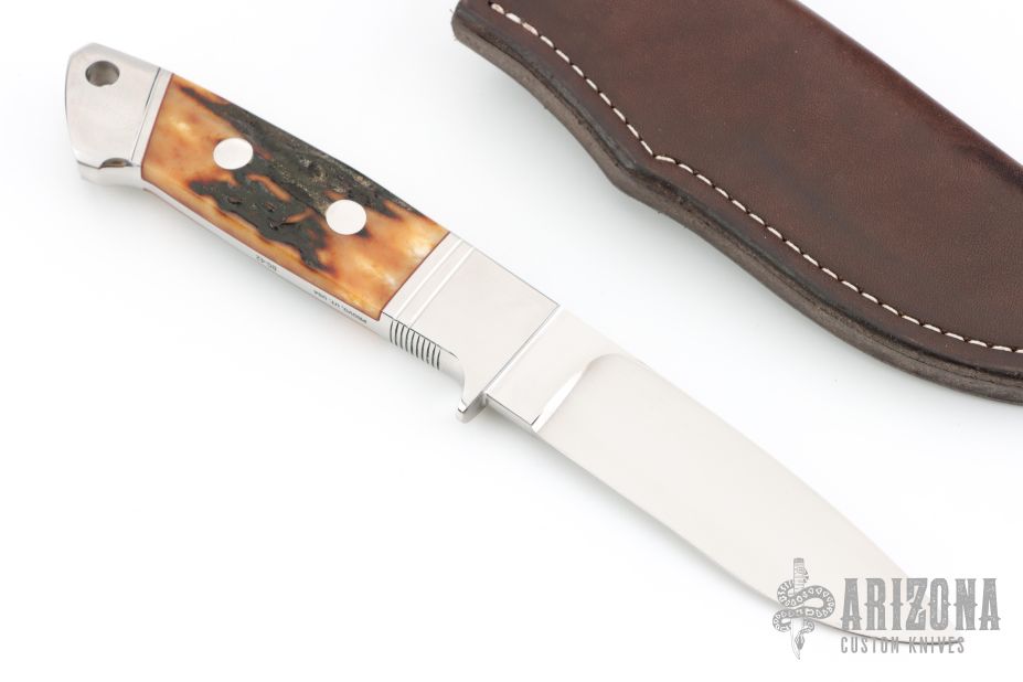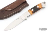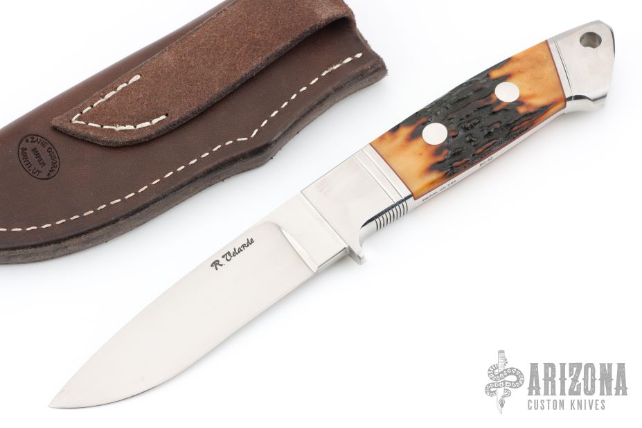 This integral hunter by Ricardo Velarde features a hand-rubbed satin finished blade, .189" blade stock and .985" blade depth at the ricasso, full integral construction with tapered tang. The handle has well matched stag inserts with red liners and stainless steel pins, fluted guard and butt, notched thumb and finger rests. Lanyard hole at the butt. Comes with a brown leather sheath and a leather zippered case. Excellent condition.