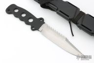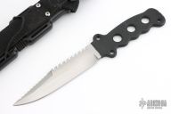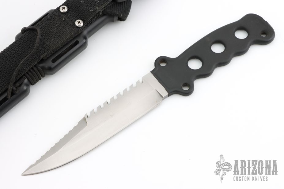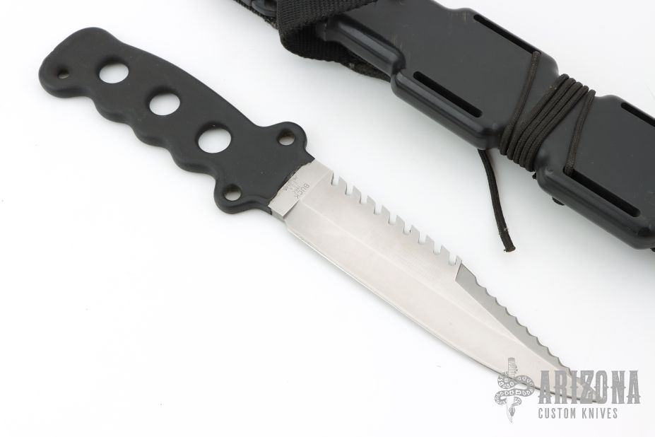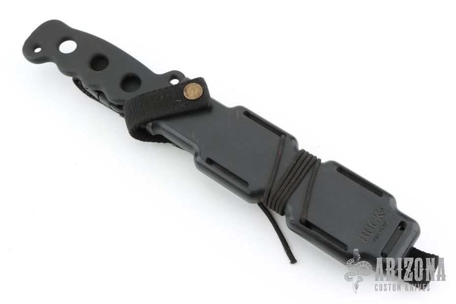 This Buckmaster LT by Buck Knives was released in January 1986, a total of 6038 were made until October 1989. It features a bead blasted blade with serrated and sharpened top edge, sawteeth on the spine, .245" blade stock and 1.454" blade depth, full tang construction with a rubber coated grip. comes with original sheath. Has some scuffs and scratches, might have been resharpened, otherwise good condition.