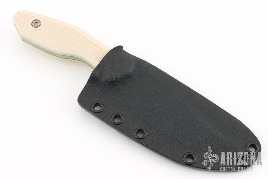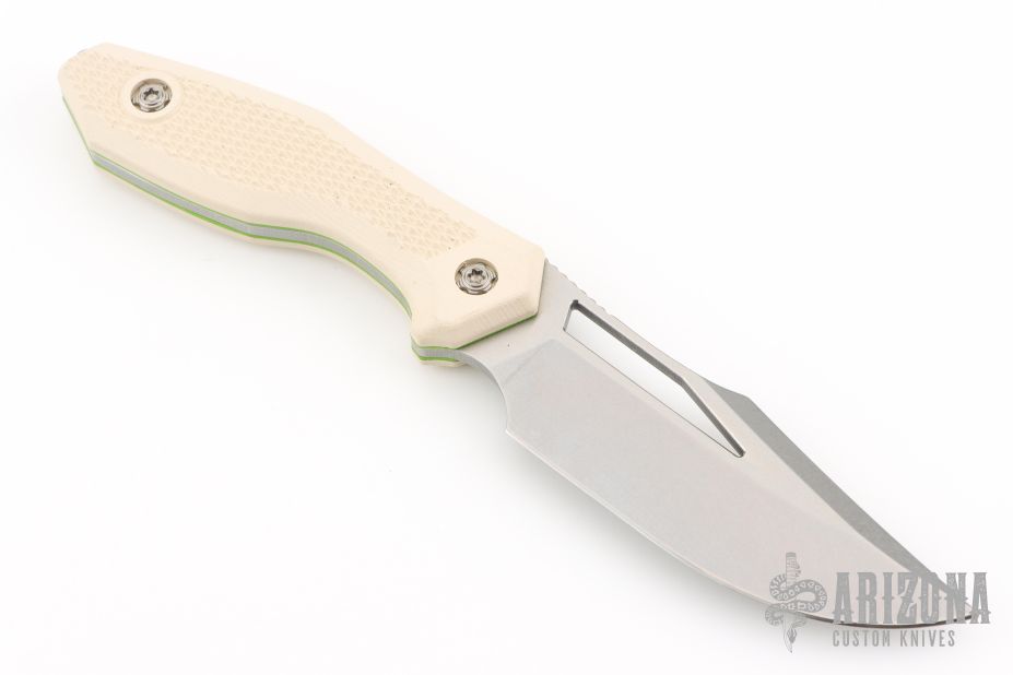Handle scales are machined from white paper micarta. They are secured to the full tang with torx screws made by TiConnector. The scales can be removed for easy cleaning and maintenance. The tang extends past the scales to create a glass breaker that doubles as a lanyard hole. The handle is exceptionally comfortable when choking up on the blade using the choil or held further back for more leverage.
