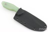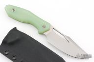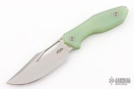 Handle scales are machined from jade G10. They are secured to the full tang with torx screws made by TiConnector. The scales can be removed for easy cleaning and maintenance. The tang extends past the scales to create a glass breaker that doubles as a lanyard hole. The handle is exceptionally comfortable when choking up on the blade using the choil or held further back for more leverage.