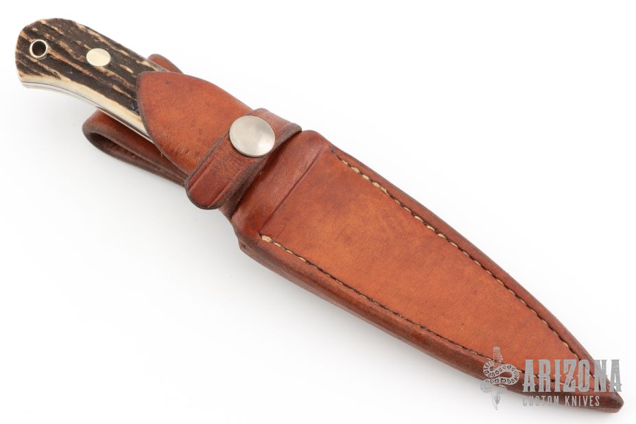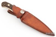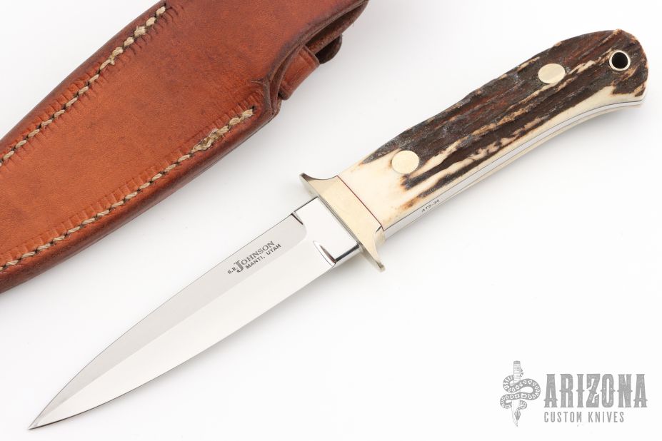 This Dagger by SR Johnson features a mirror polished double edged blade, .186" blade stock and .886" blade depth, full tapered tang construction. The handle has a nickel silver double guard, stag scales with nickel silver pins and thong hole. Comes with brown leather sheath. Excellent condition.