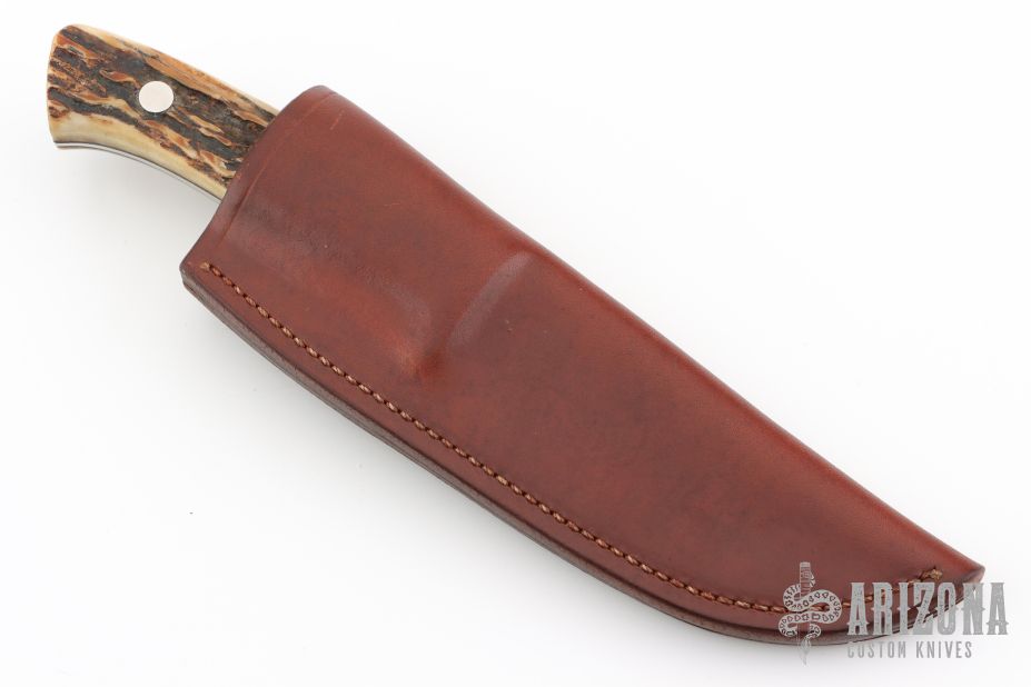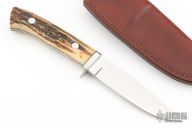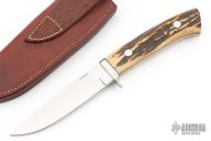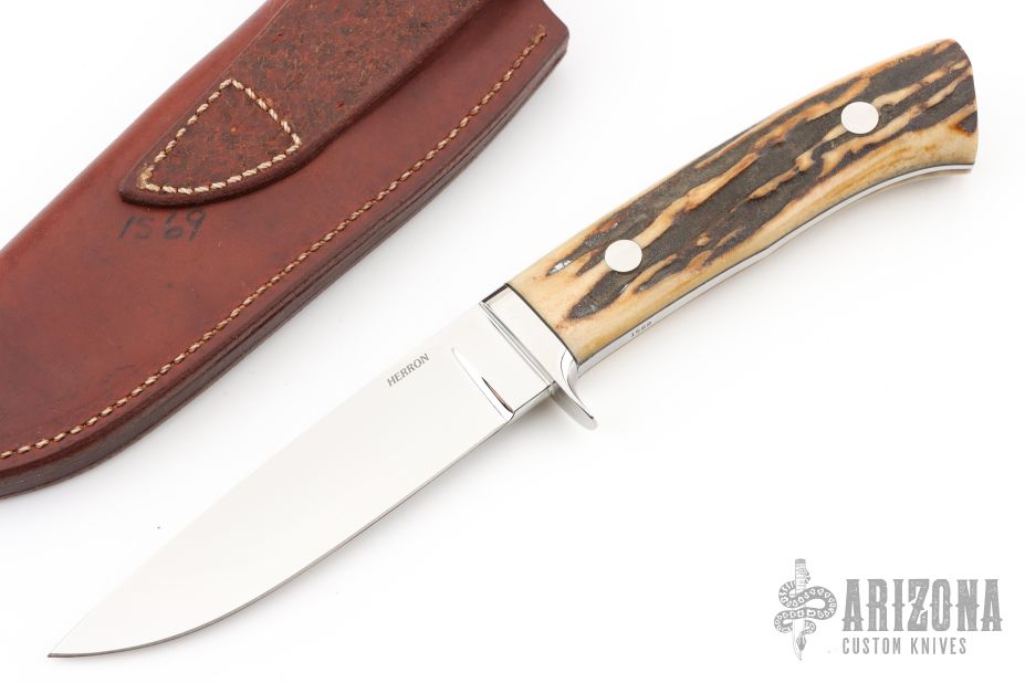 This Model 6 Hunter #1569 by George Herron has a mirror polished stainless steel drop point blade with .187" blade stock, .993" depth, full tapered tang construction. The handle features a stainless steel guard and stag scales with black liners. Comes with original brown leather sheath. Excellent condition.