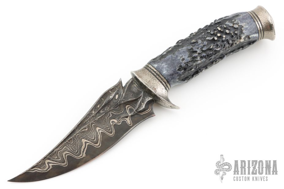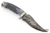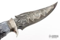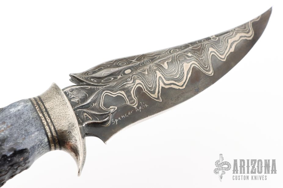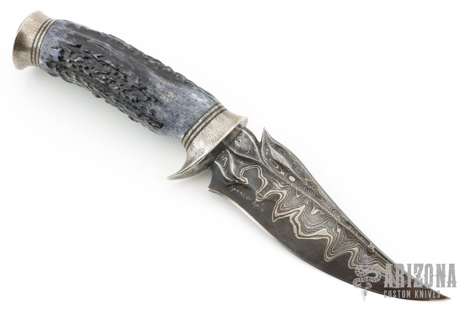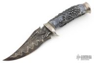 This Knife by Spencer Aplin features a San Mai Damascus blade with carved fullers and ricasso, .299" blade stock and 1.592" blade depth, hidden tang construction. The handle has a hammered nickel silver guard and butt, stag grip with a black and hammered nickel silver spacers. Excellent condition. Stunning!