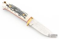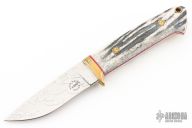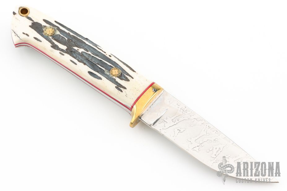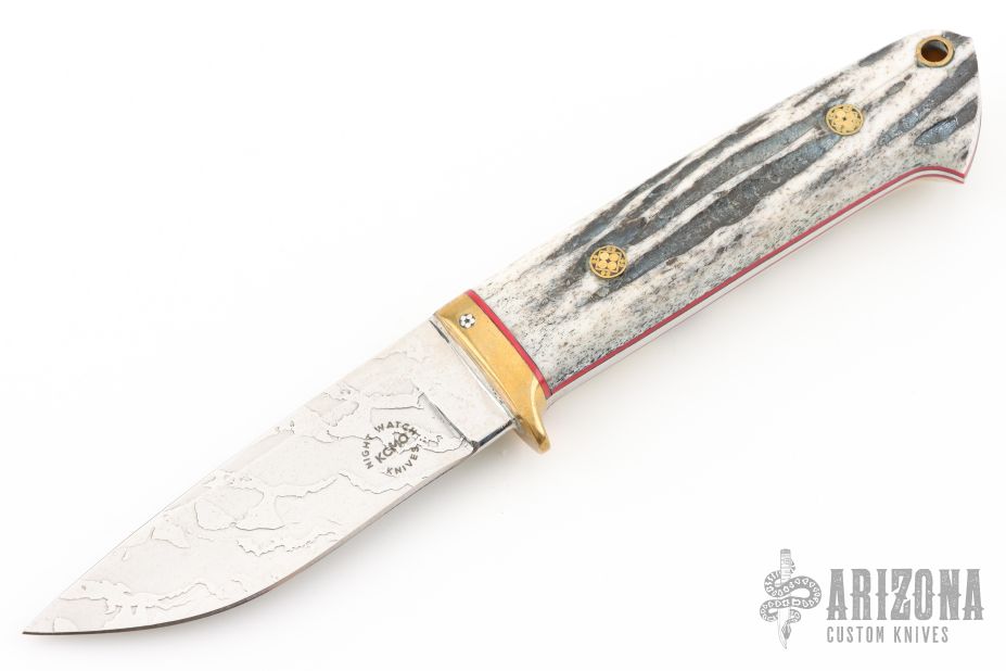 This knife by Night Watch Knives features an acid etched blade with .134" blade stock and .988" blade depth, full tapered tang construction. The handle has a brass guard with mosaic pin, stag jigged bone scales with red liners and mosaic pins, lanyard hole. Excellent condition.  #009 on the blade spine