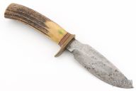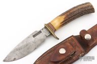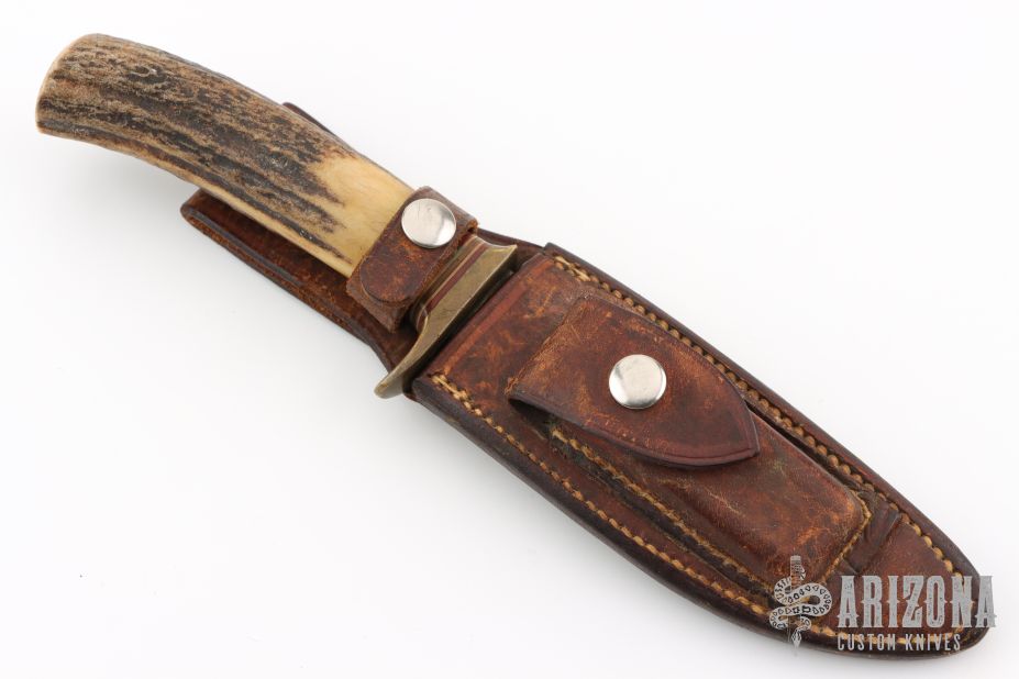 The Model 11 is the original drop-point blade. Designed by Tommy Thompson, noted Alaskan guide, in 1952 for big-game skinning, with point dropped below top of blade to prevent cutting too deeply through skins when used point first. The blade is satin finished with a notched thumbrest, .190" blade stock and 1.382" blade depth, hidden tang construction. The handle has a brass guard, stag grip, 7 red/white/blue spacers. Comes with original roughback brown leather sheath with white sharpening stone and baby dots. Has some pitting, oxidation and scratches on the blade, fair condition. Stag handle made late Vietnam 1972-1975