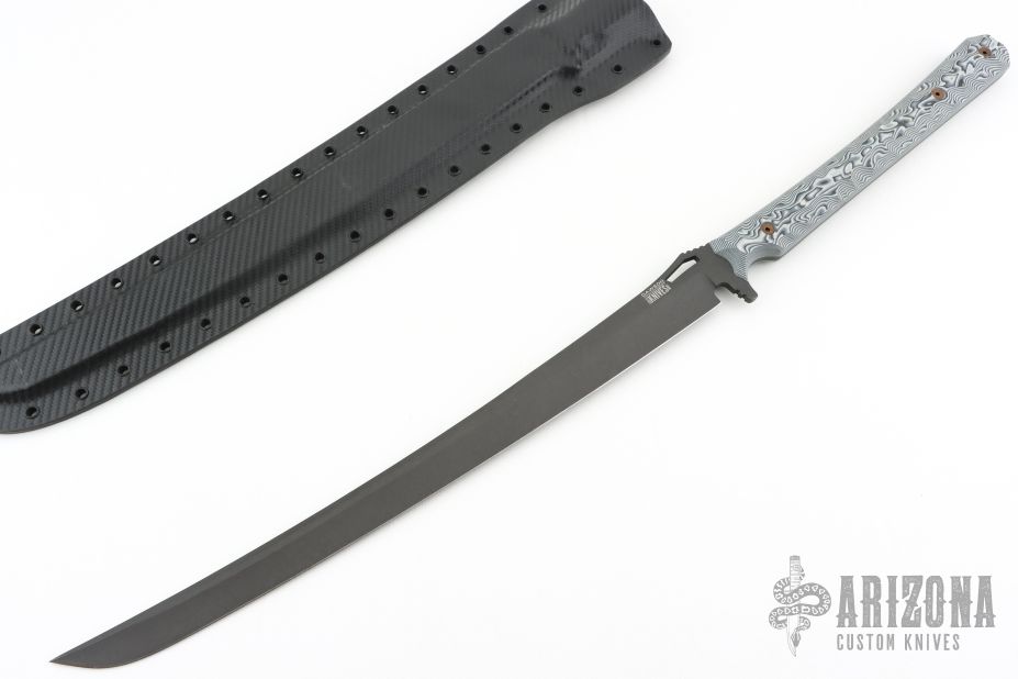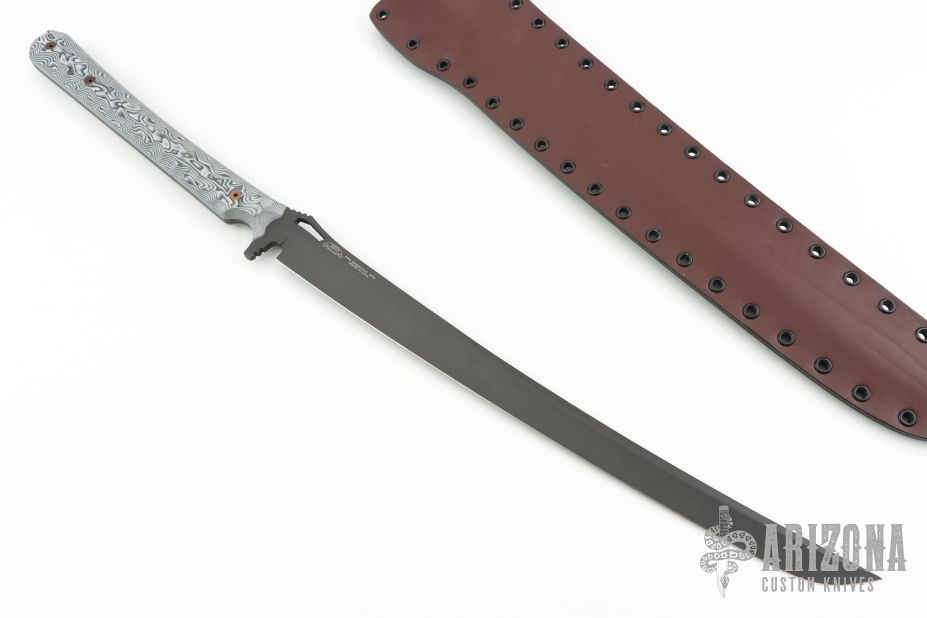 This Many Waters Ninjato Sword by Dawson Select features a black blade with false top edge and notched thumbrest, .204" blade stock and 1.501" blade depth, full tang construction. The handle has black/white/grey scales. Comes with a brown leather and kydex sheath. Excellent condition. #006 on the blade.