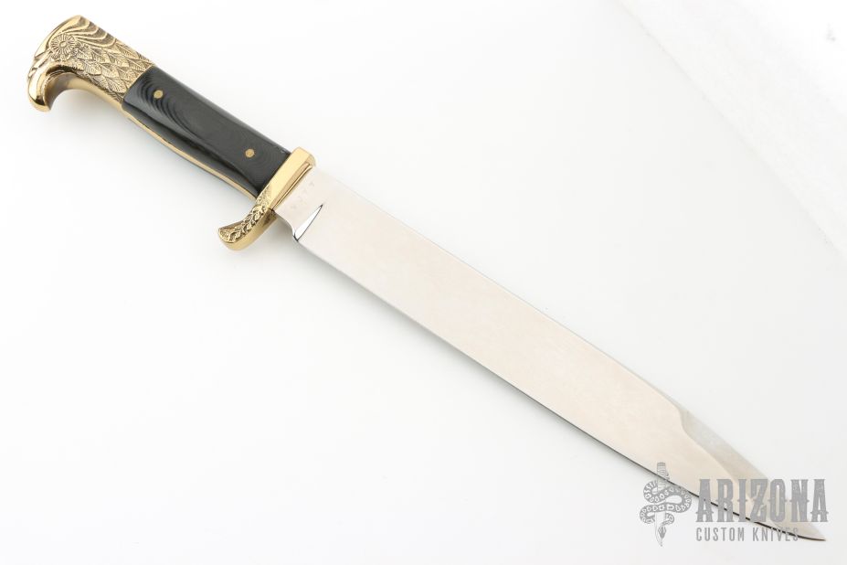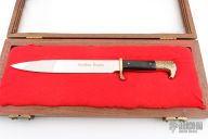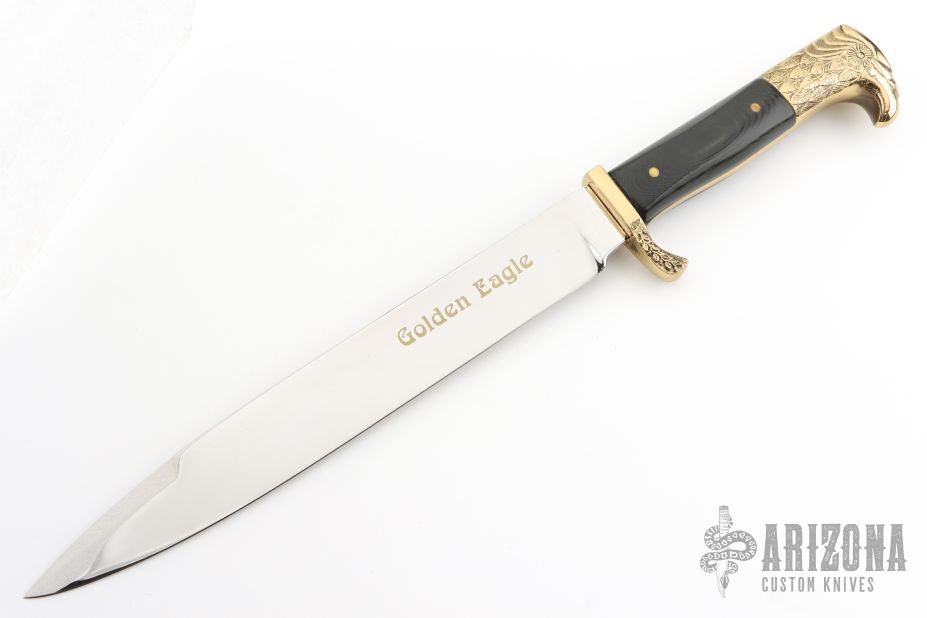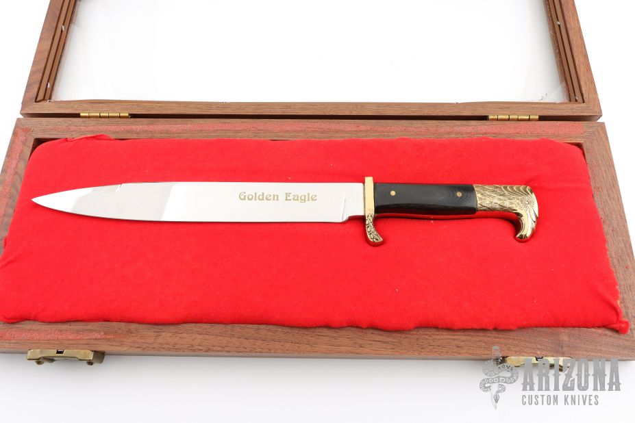 This collector's knife from Kershaw is #4405 of 5000 made in Solingen, Gemany. Features mirror polish blade with "Golden Eagle" engraving. Blade is 1/4" thick and 1 1/4" deep. Brass guard and pommel that features the head of an eagle. Comes with display case. Excellent condition.