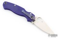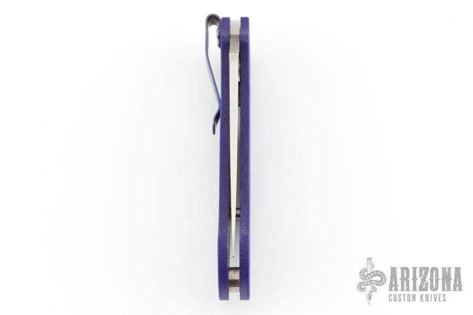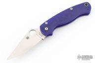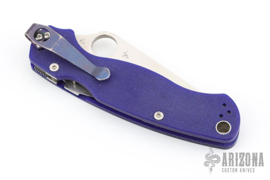 This Paramilitary 2 from Spyderco has a satin finished clip point blade with thumbhole and notched thumbrest. Handle is blue G10 with stainless steel liners and deep carry anodized titanium 4-way reversible clip. Has some scratches on the clip, excellent condition otherwise.