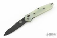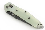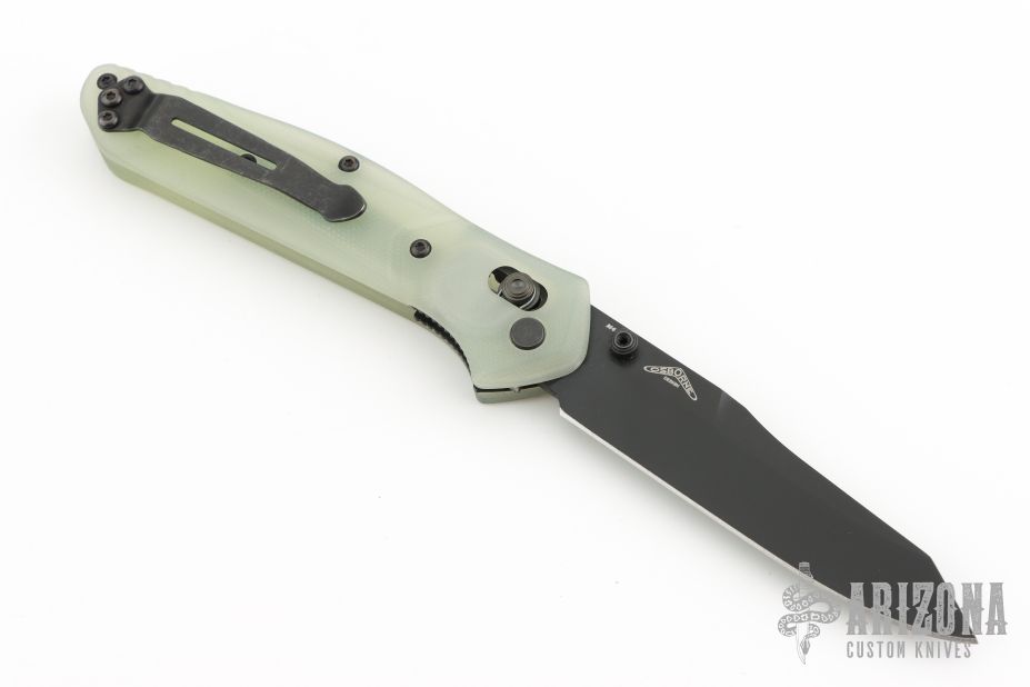 This 940BK Osborne Axis Lock Folder from Benchmade has a black coated clip point blade with false top edge and dual thumbstuds. Handle is jade G10 with a black finished stainless steel tip up clip (RH/LH Reversible). Nice blade seating and lockup. Excellent condition.