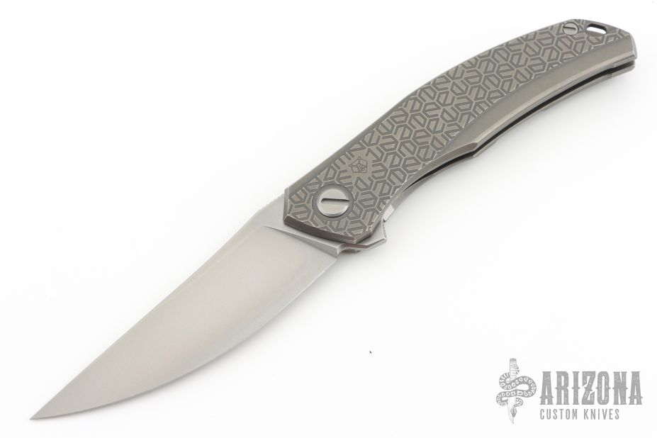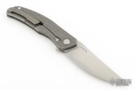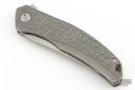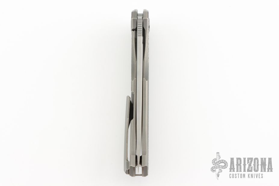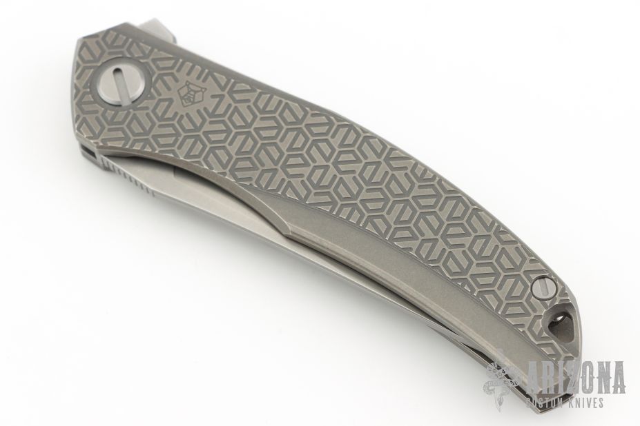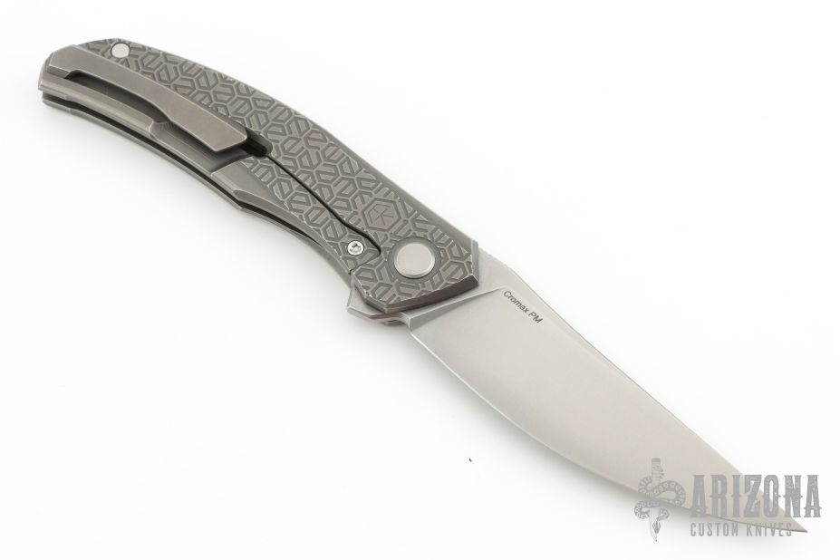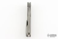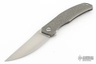 This Quantum R1P by Shirogorov features a stonewashed Cromax PM blade with notched thumbrest and flipper. The handle has a tumbled and milled titanium frame, backspacer, tip up titanium clip with hidden screws. Rides on MRBS, nice detent, lockup and blade seating. Comes with original box and COA. Excellent condition.