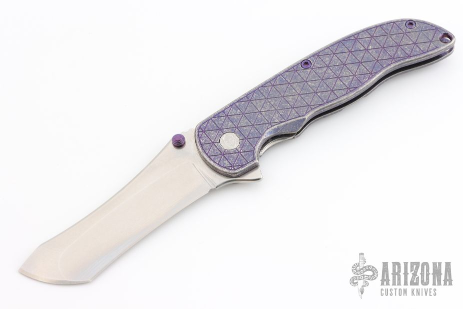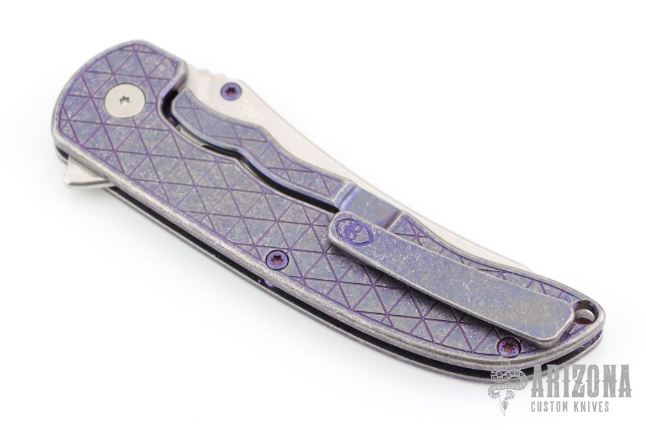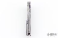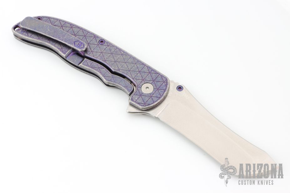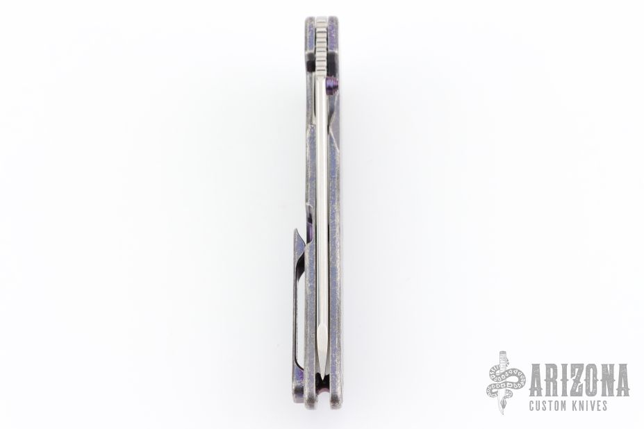 This Norseman (#7697) by John Grimsmo features a tumbled blade with dual anodized titanium thumbstuds, notched thumb ramp and flipper. Stonewashed and anodized titanium frame with a Flatland pattern front scale and anodized titanium screws. Matching tip up pocket clip. Very smooth action that requires no wrist movement. Nice detent, lockup and blade seating. Rides on ceramic bearings. Comes with original box and COA dated July 12, 2024. Excellent condition.
