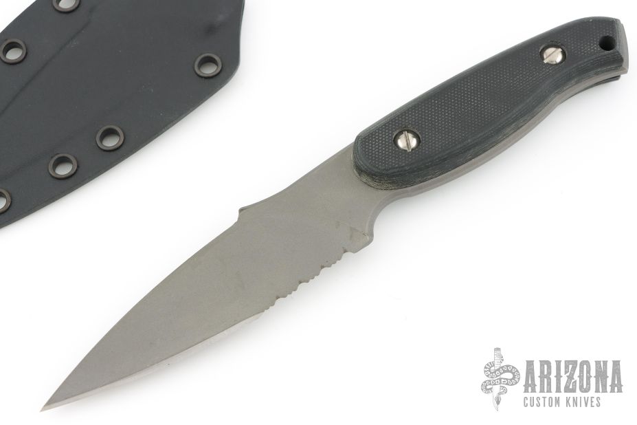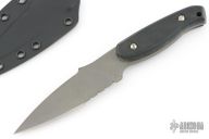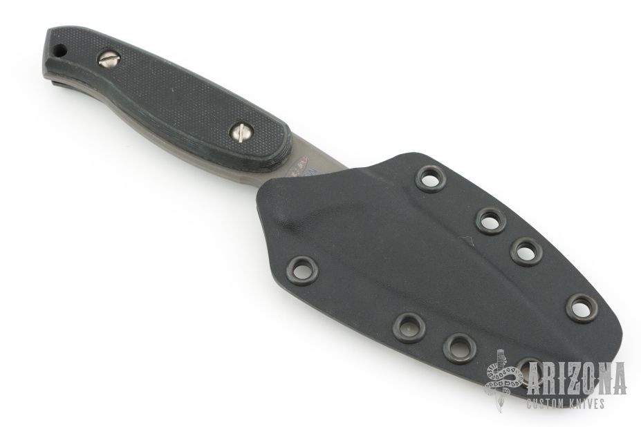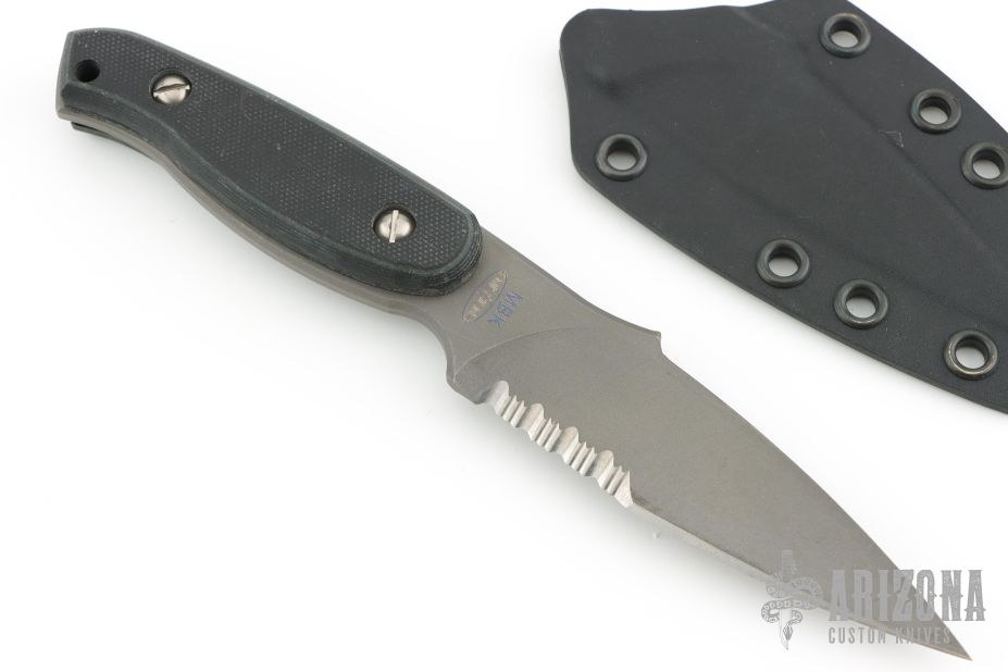 This MBK by Mission Knives features a bead blasted titanium drop point partially serrated blade with a thumb ramp. The handle is comprised of black G10 scales over full tang construction with lanyard hole in pommel. It has .190" blade stock and 1.184" blade depth. Includes kydex sheath. Has some light scuffs, otherwise excellent condition.