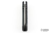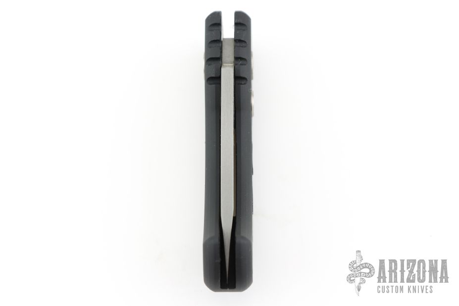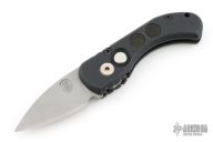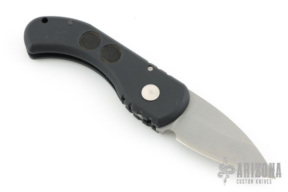 This California Special button lock auto has a bead blasted stainless steel drop/ spear point blade. Handle is black anodized aluminum with non-slip inserts. #971209 on the handle. Comes with original box. Excellent condition.