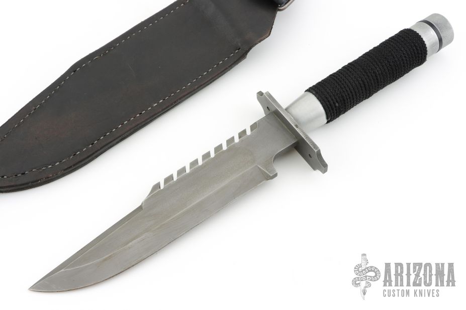 This Jack Crain LS1 Tribute features a bead blast blade with sawteeth on the spine and a false top edge, .262" blade stock and 1.826" blade depth, hidden tang construction. The handle has a steel double guard, hollow tube handle wrapped in black nylon cord, and a removable butt cap with storage area. Comes with a black leather sheath. Has some scuffs and scratches, has been sharpened, otherwise good condition.