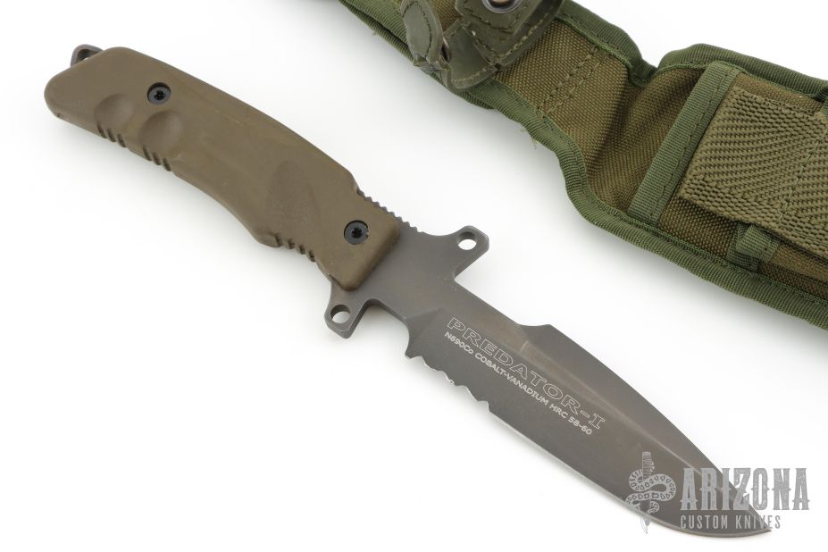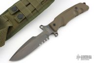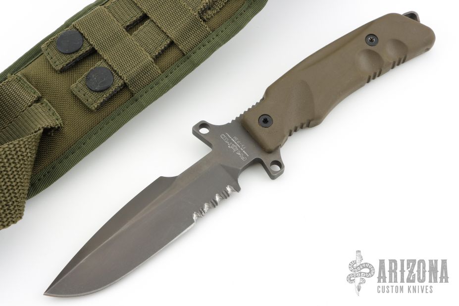 This fixed blade by Fox Knives features a black/grey drop point blade with partial serrations and a hidden tang construction. The handle is green rubber. Includes a nylon sheath. Has some light scuffs, otherwise excellent condition.
