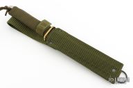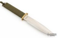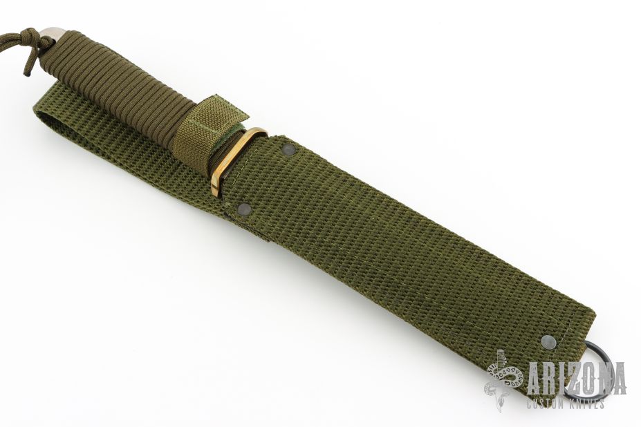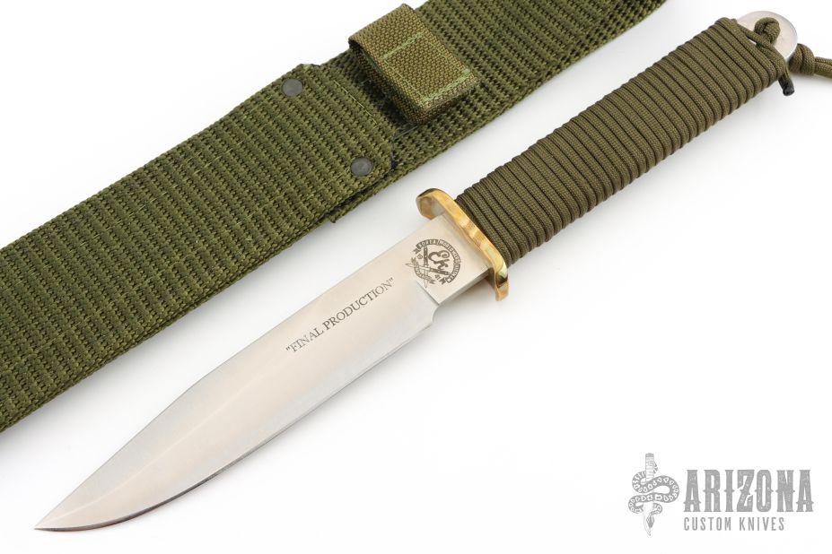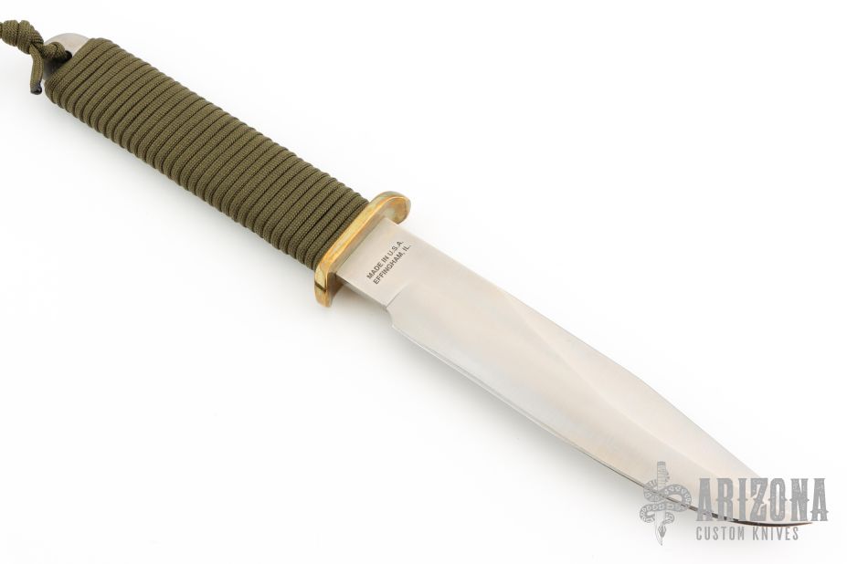 This EK Commando Bowie has a satin finished clip point blade with full tang and false top edge. Blade width .187", depth 1.280". Handle has green paracord wrap with a brass guard and lanyard hole. Comes with an EK Knives box, and nylon sheath with velcro closure and belt loop. Excellent condition.