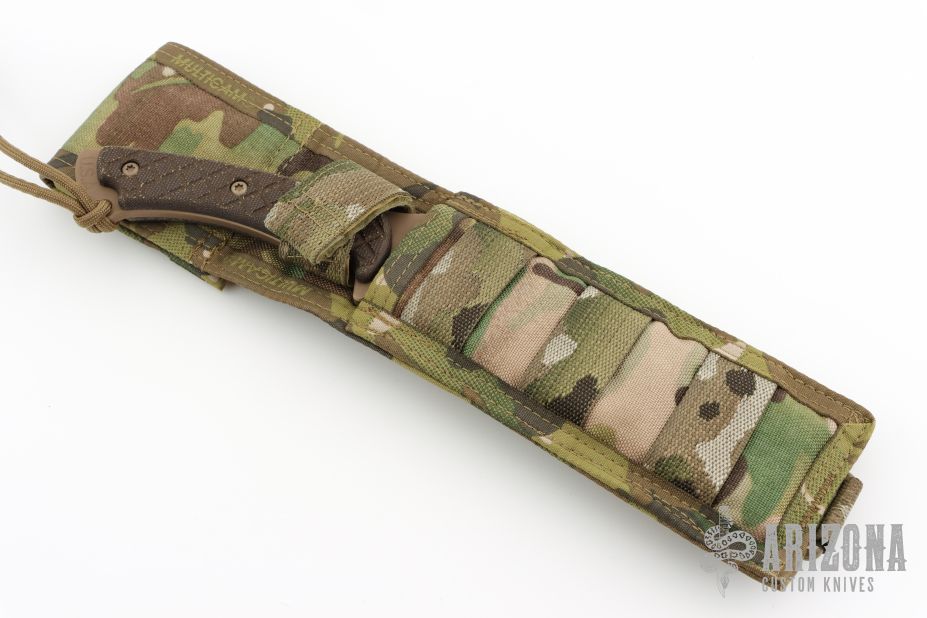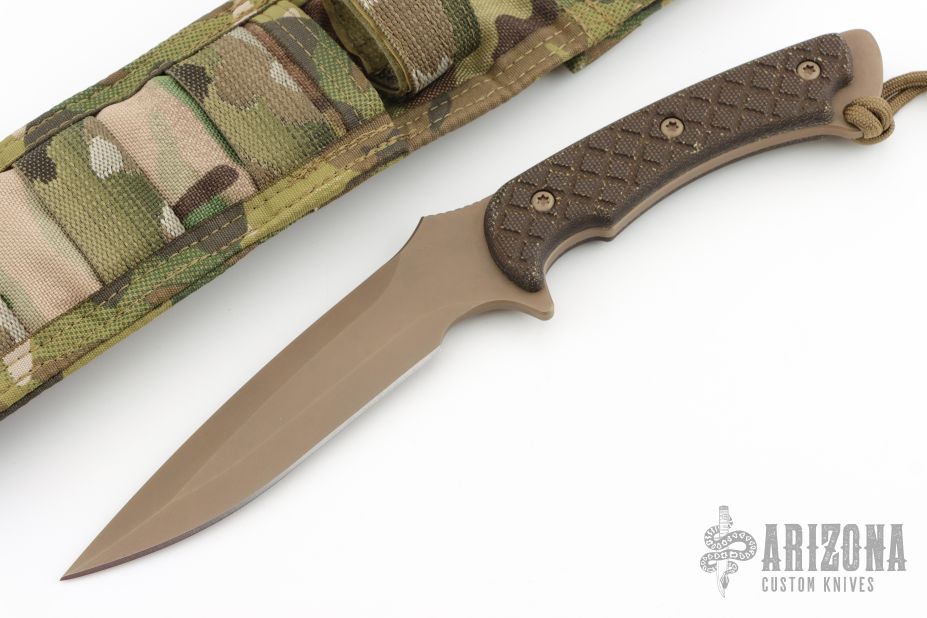 This Ares features a CPM S335VN blade with tan coating (SpartaCoat - PVD - ZrN) and micarta scales. Includes canvas sheath and a nylon sheath. Excellent condition. Comes with original box and papers.