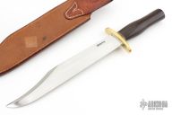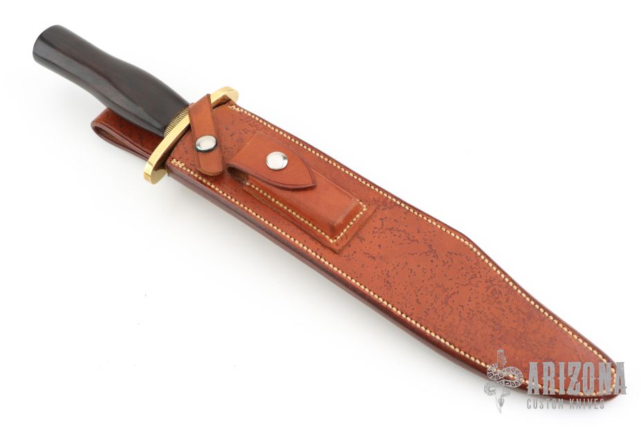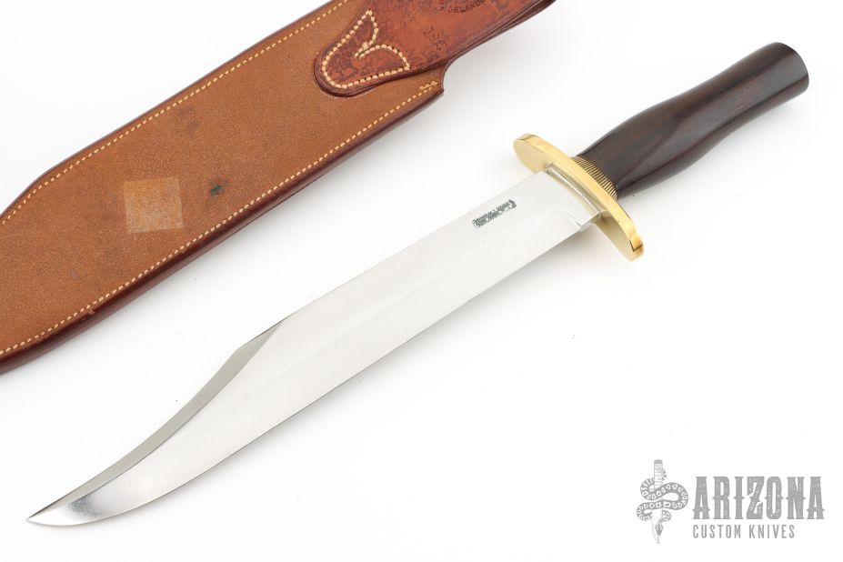 This Vintage 1970s Model 12-11 Confederate Bowie by Randall Made Knives features a satin finished carbon steel blade with sharpened top edge, .220" blade stock and 1.772" blade depth, hidden tang construction. The handle has a forward curved brass guard and scalloped brass collar, rosewood grip. Comes with a Johnson Roughback brown leather sheath and a zippered case. Has some light scratches, otherwise excellent condition.