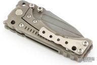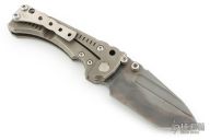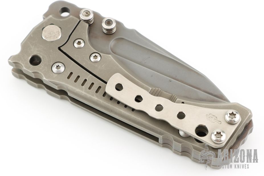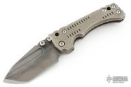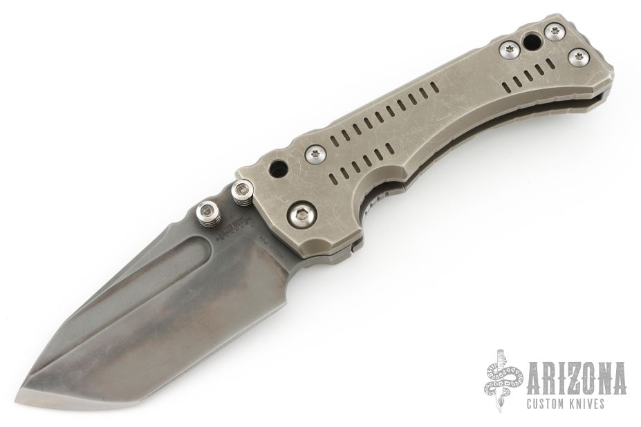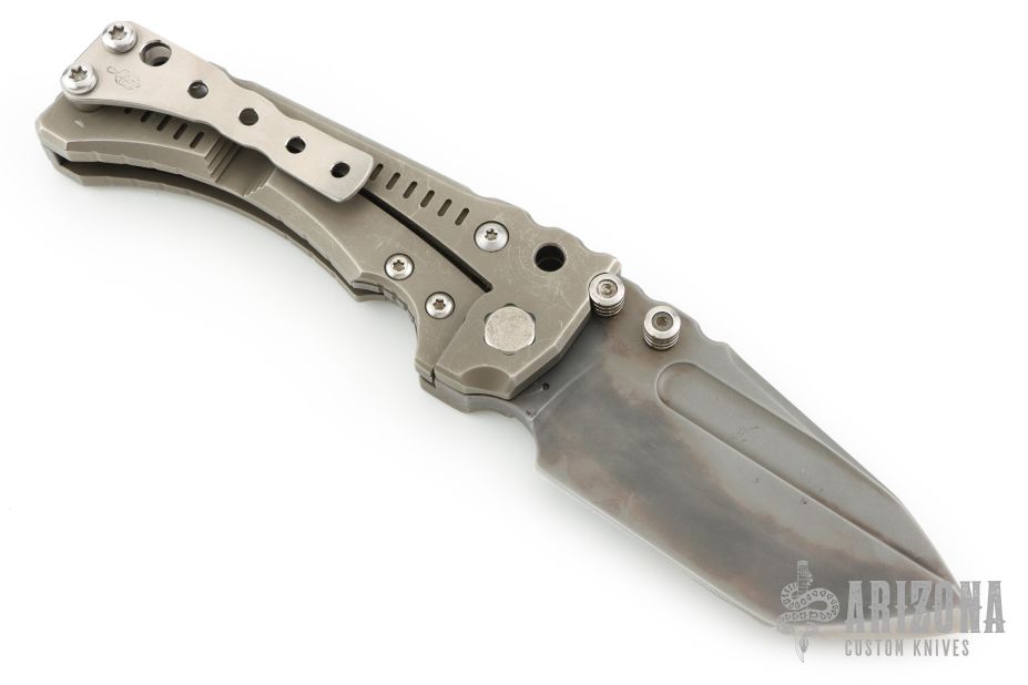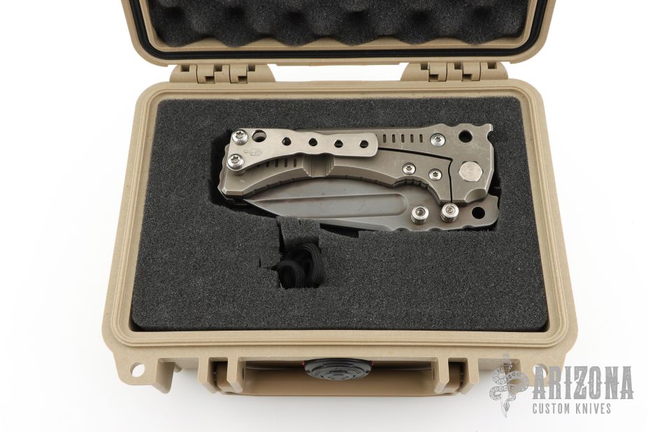 This Custom T-1 Folder by Miller Brothers Blades features a Z-Wear PM tanto blade with fullers, notched thumbrest and dual thumbstuds. The handle has a milled and sculpted titanium frame with matching tip up clip and a steel backspacer. Comes with a pin that can be inserted into the handle when open to lock the blade in the open position. Comes with original Pelican case and COA dated 9-2018. Has scuffs and scratches, has been carried, otherwise good condition.
