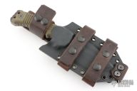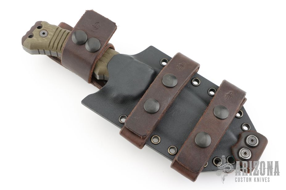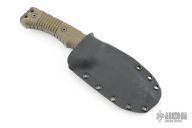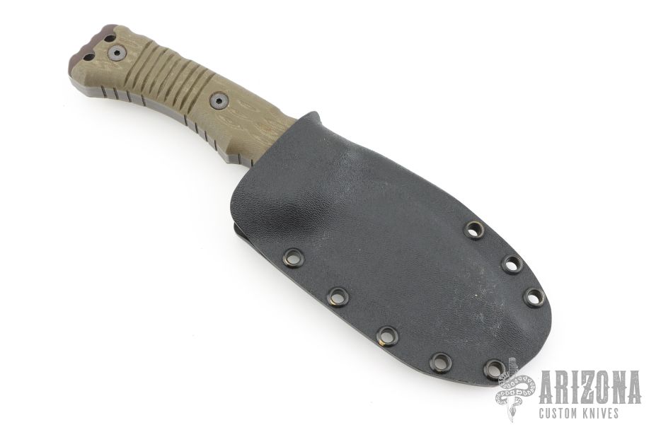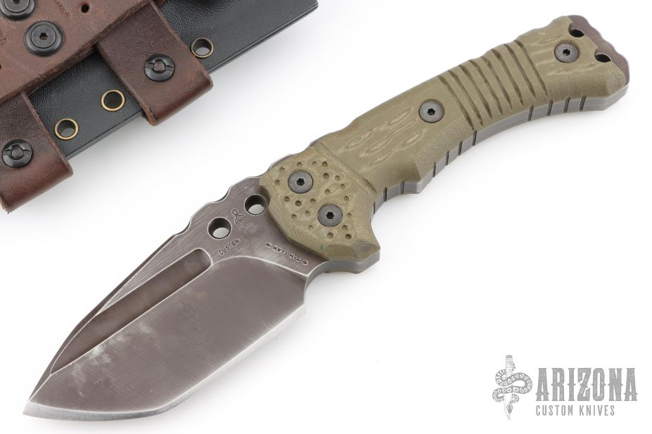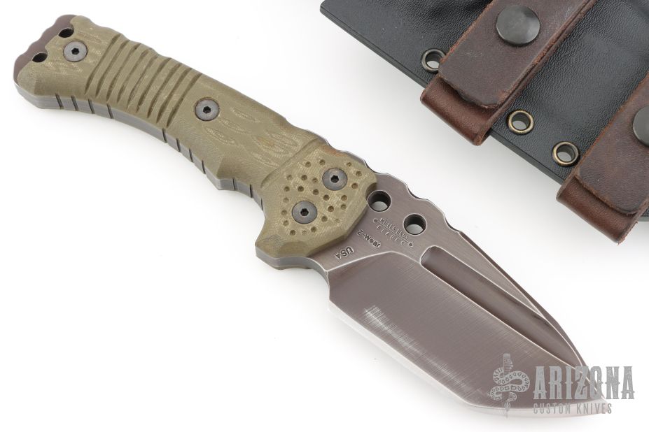 This Custom T-1 Fixed Blade Compact by Miller Bros Blades features a tanto blade with notched thumbrest made from Z-Wear PM steel, .326" blade stock 2.059" blade depth, full tang construction. The handle has green G-10 scales with notched tang top and bottom. lanyard holes at the butt. Comes with original kydex/leather sheath, and an additional kydex sheath. Has some sheath marks on the blade, otherwise excellent condition.