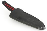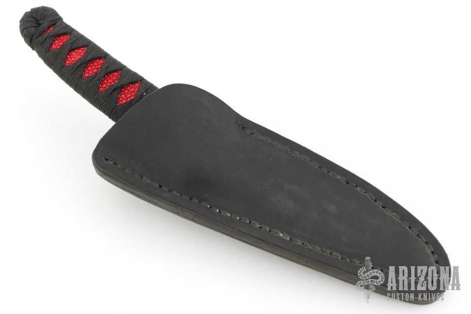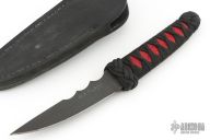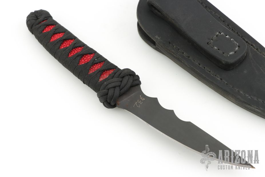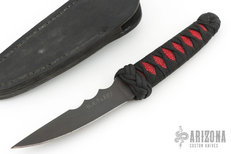 This "Windcutter" by HM Tubbs features a black coated blade with .240" blade stock and .880" blade depth, hidden tang construction. The handle is cord wrapped over red ray skin. Includes a hand stitched leather sheath. #932. Has a couple light scratches, otherwise excellent condition.