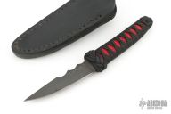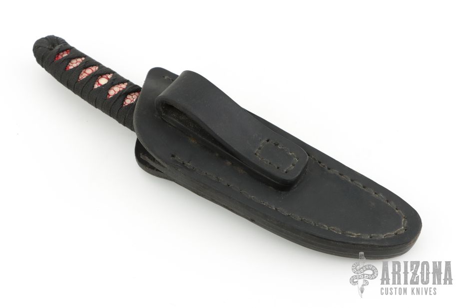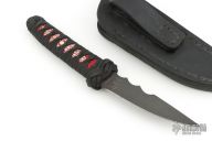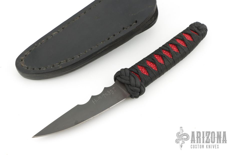 This "Windcutter" by HM Tubbs features a black coated blade with .240" blade stock and .910" blade depth, hidden tang construction. The handle is cord wrapped over red ray skin. Includes a hand stitched leather sheath. Has a couple light scratches, otherwise excellent condition. #958