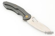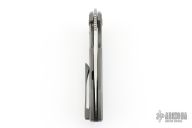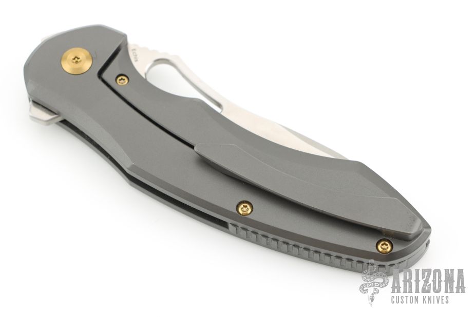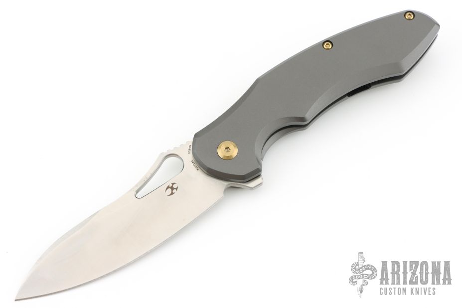 This knife by Kansept features a satin-finished blade.  The handle has a bead-blasted titanium frame with a matching tip-up pocket clip and backspacer.  Has anodized hardware. Comes with a kizer nylon pouch. Has a couple light scratches, otherwise Excellent Condition.