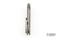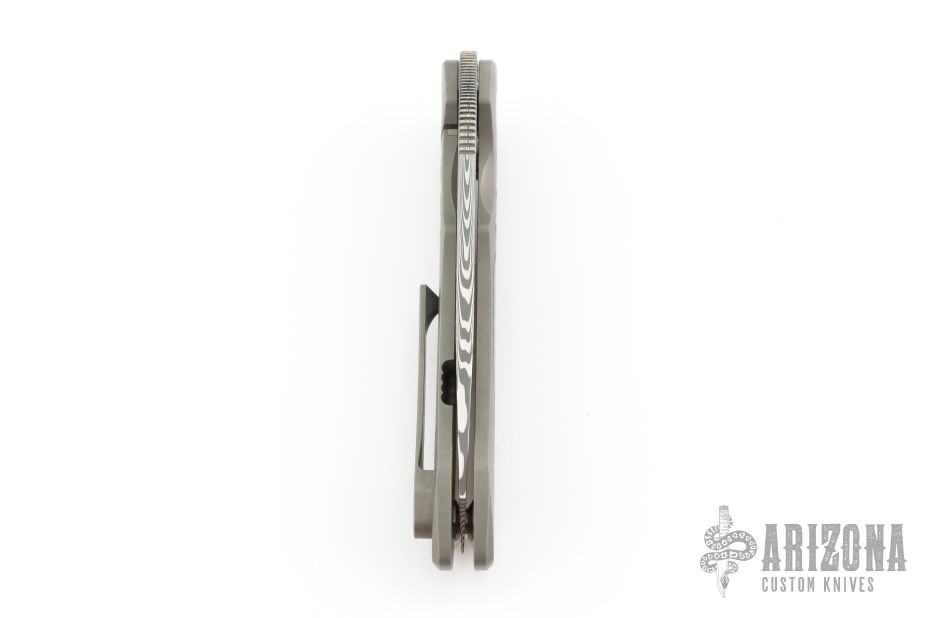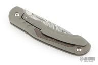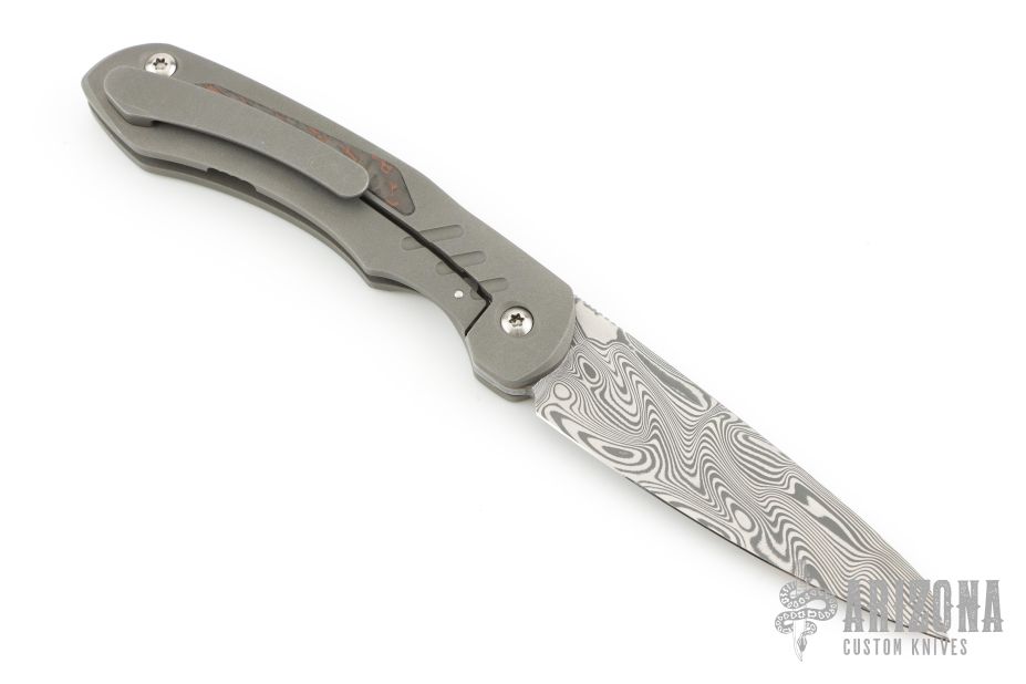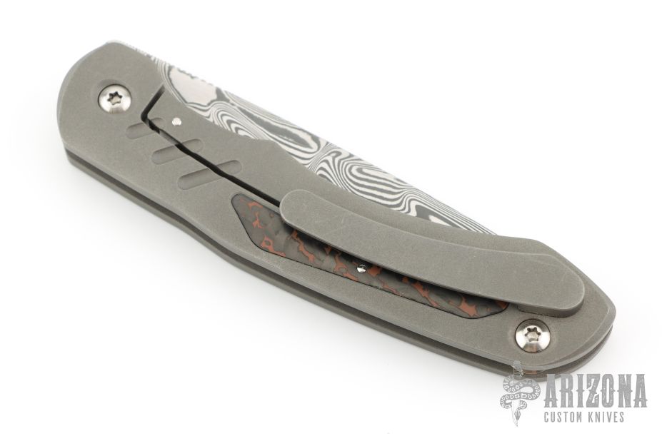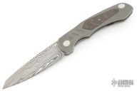 This knife from Clyde Challenor features a Damascus blade with notched thumbrest/front flipper. The handle has a bead blast finished titanium frame with red carbon fiber inlay, and matching titanium tip up clip. Has adjustable lockface insert. Comes in a nylon zipper case. Has some scuffs and scratches, good condition otherwise.