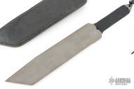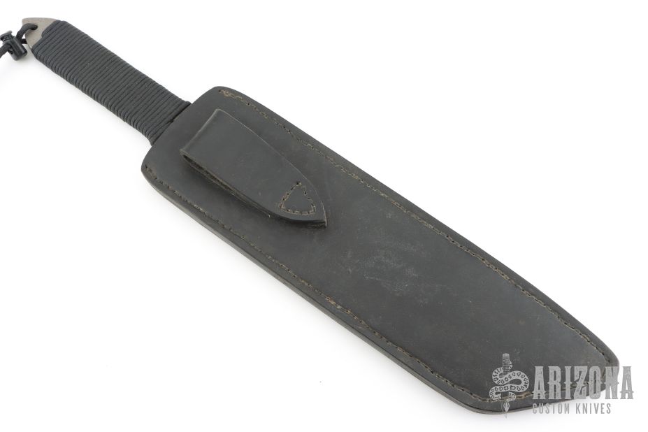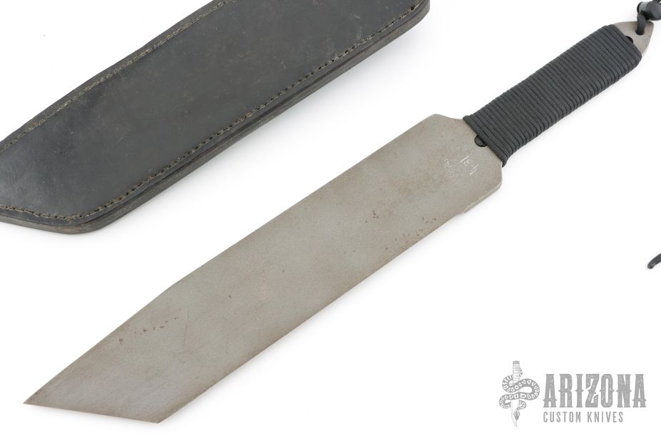 This Battle Tanto by HM Tubbs features a hand rub satin finished chisel ground blade with false top edge, .288" blade stock and 2.616" blade depth, full tang construction. The handle has black paracord wrap. Comes with a black leather sheath with belt loop. #431 on the blade. Has a couple light spots on the back of the blade, otherwise excellent condition.